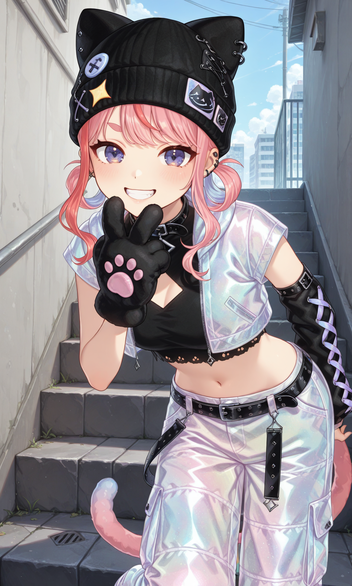 • 🐾4番目の衣装:sorahoshi paru, paru punk, cat ear, hair rings, sidelocks, beanie, cat tail, black collar, iridescent jacket, short sleeves, cropped jacket, black crop top, clothing cutout, single paw glove, single arm warmer, iridescent pants, black belt
