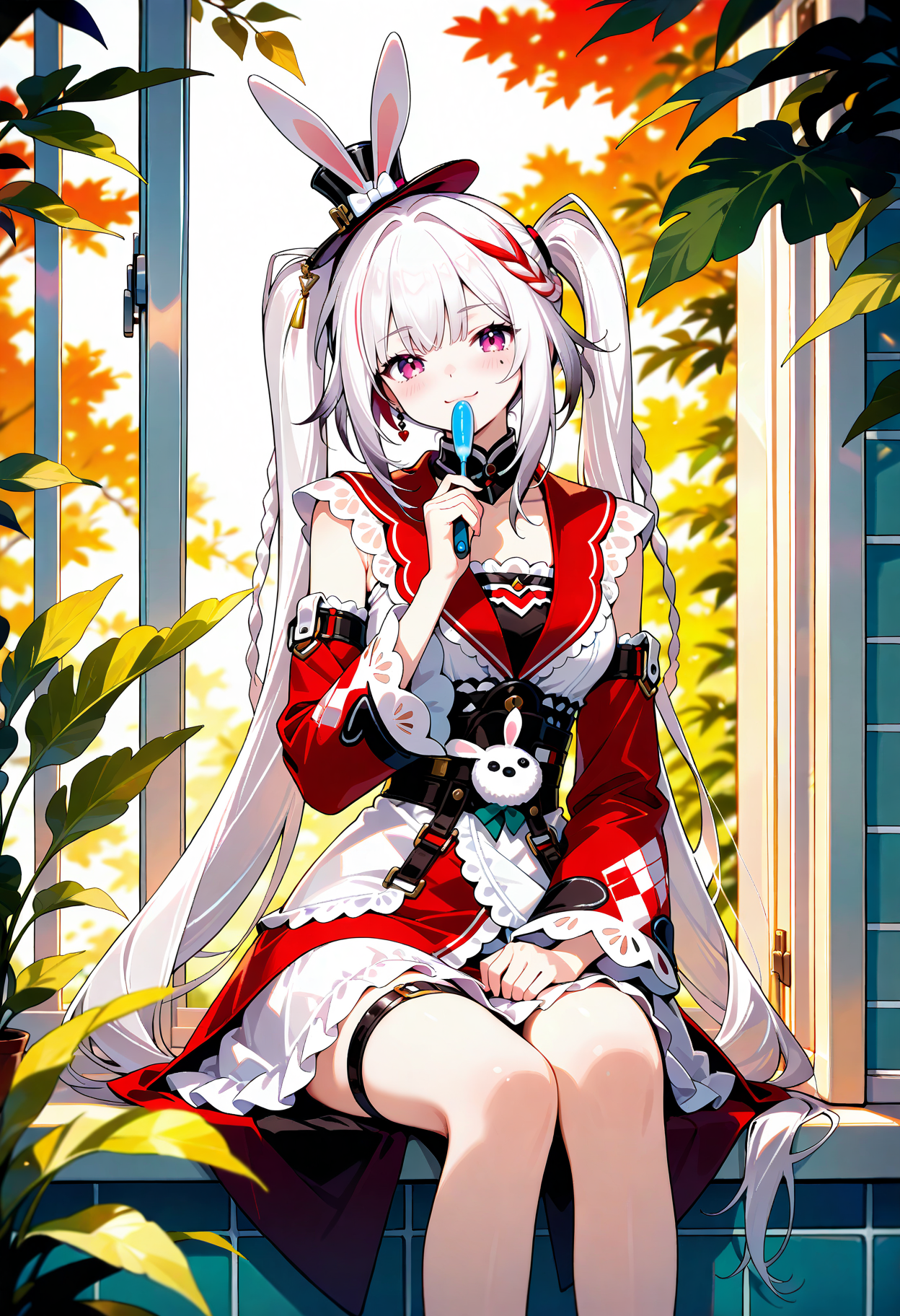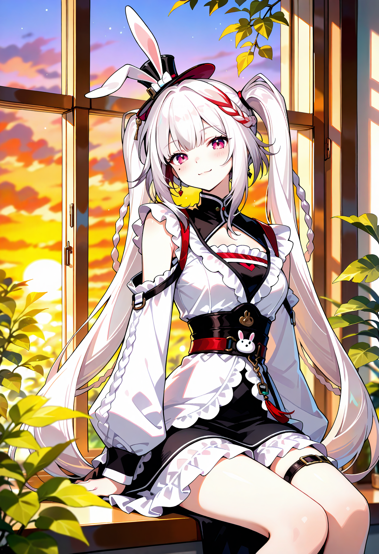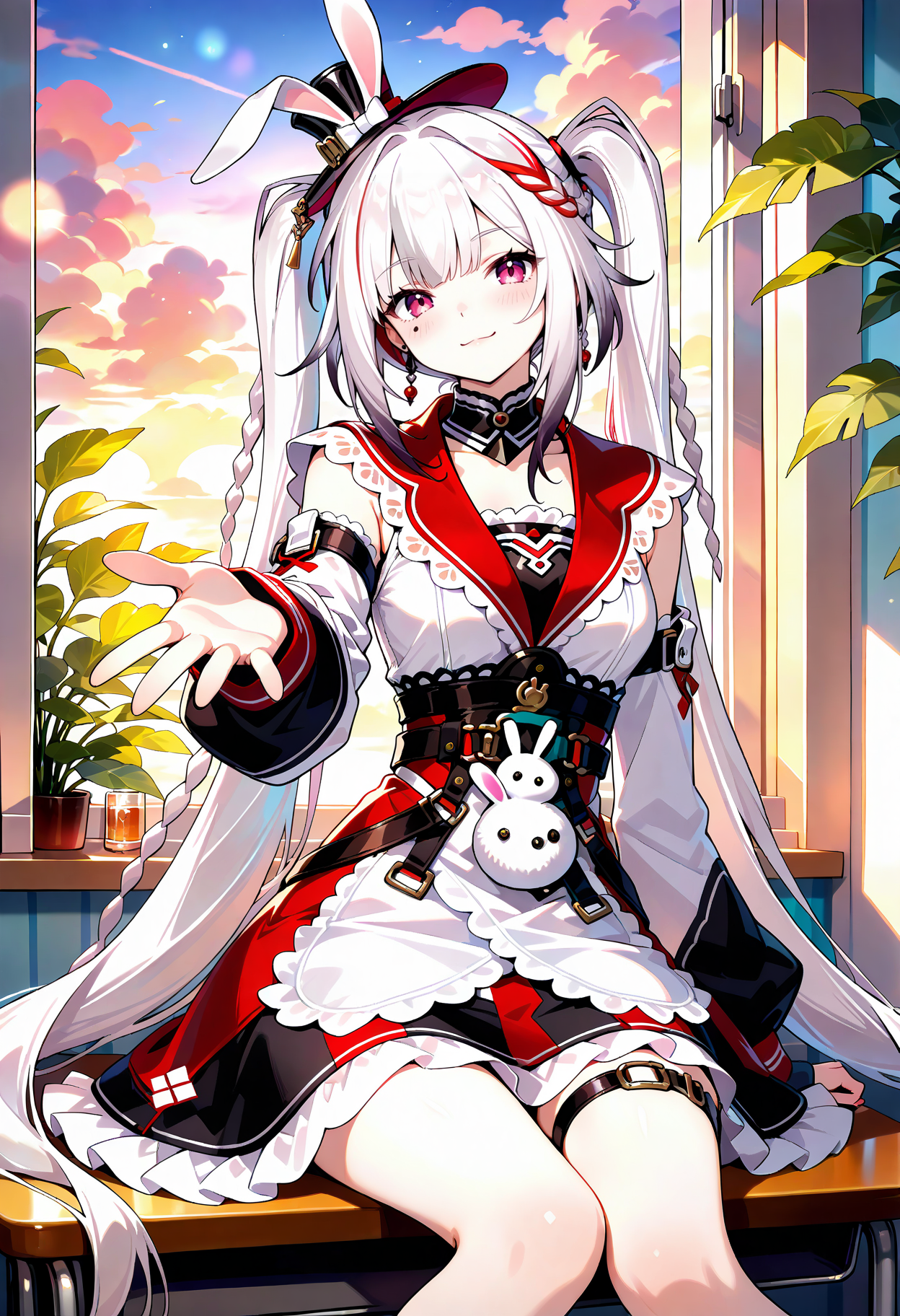 Sparxie, 1girl, 눈 밑 점, 모자, 더블테일, 허벅지 스트랩, 탑햇, 드레스, 분리된 소매, 프릴, 토끼 귀, 매우 긴 머리, 긴 소매, 미니 헤이트, 벨트, 빨간 눈