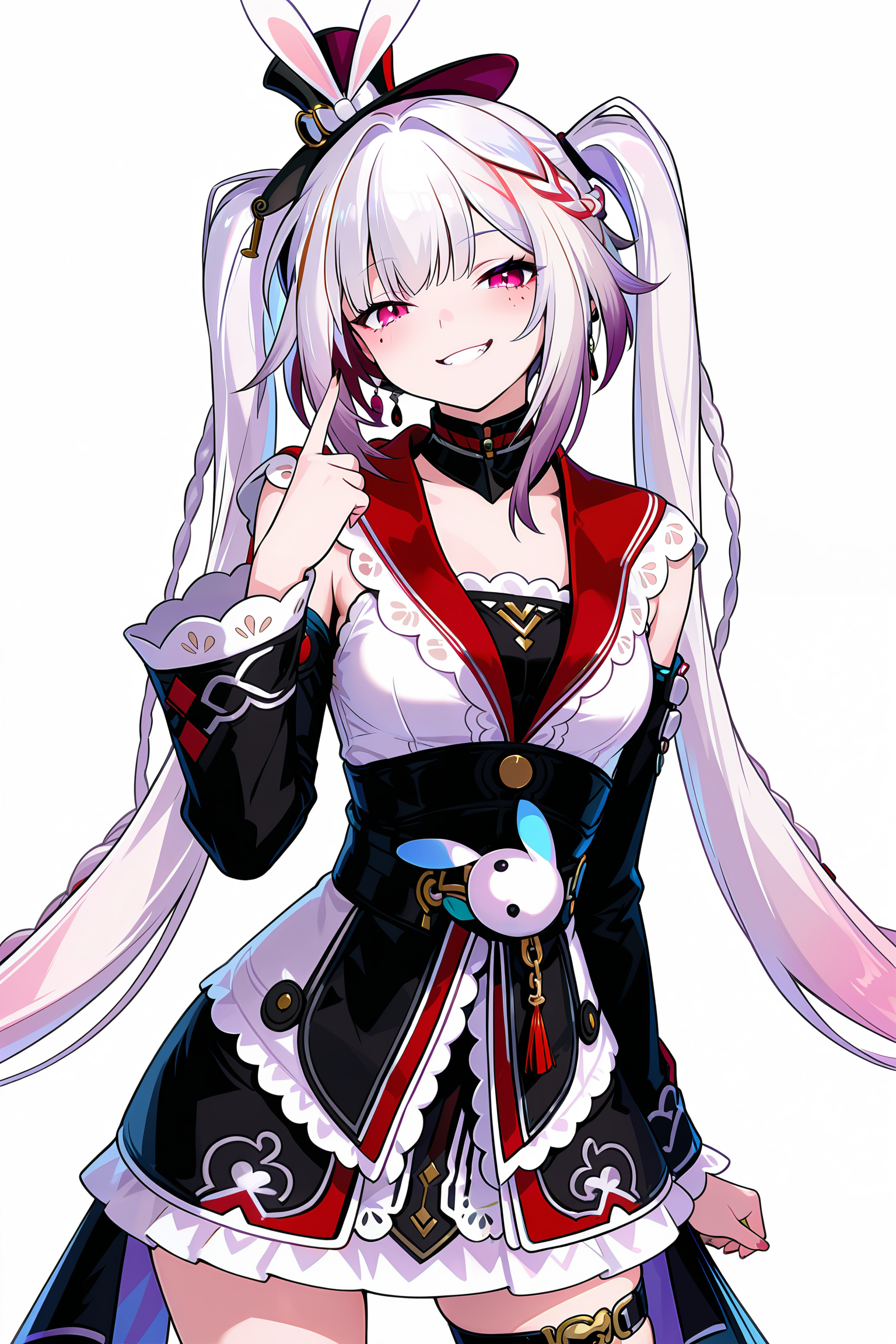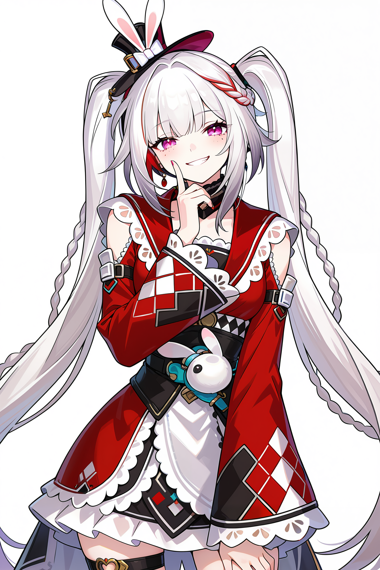 Sparxie, 1girl, mole under eye, hat, twintails, thigh strap, top hat, dress, detached sleeves, frills, rabbit ears, very long hair, long sleeves, mini hat, belt, red eyes