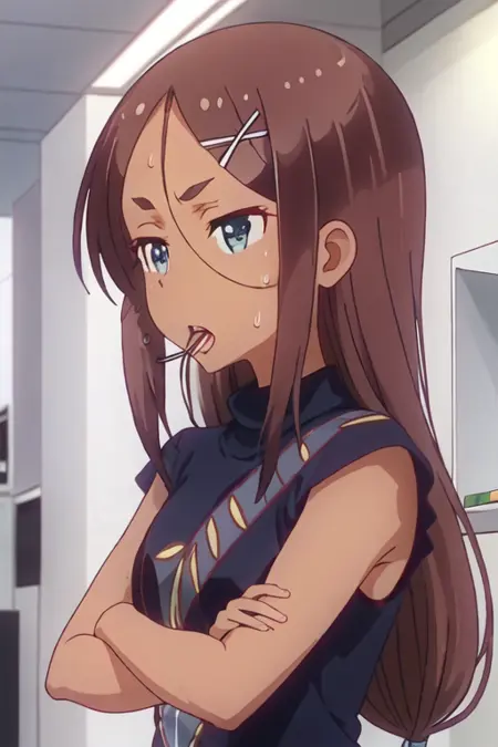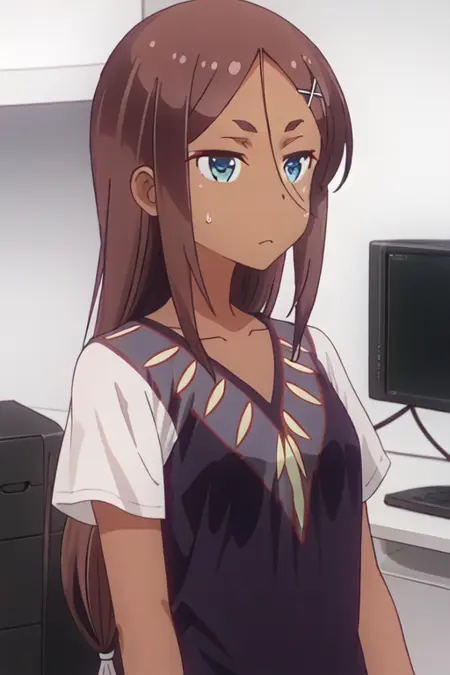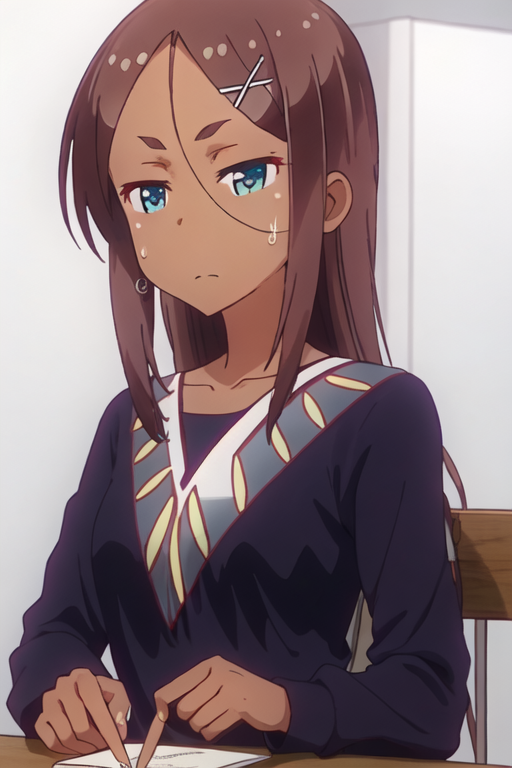 触发词为 ahagon_umiko_newgame,推荐标签为:best quality, masterpiece, highres, solo, {ahagon_umiko_newgame:1.15}, brown_hair, long_hair, dark_skin, dark-skinned_female, hair_ornament, blue_eyes, x_hair_ornament, hairclip