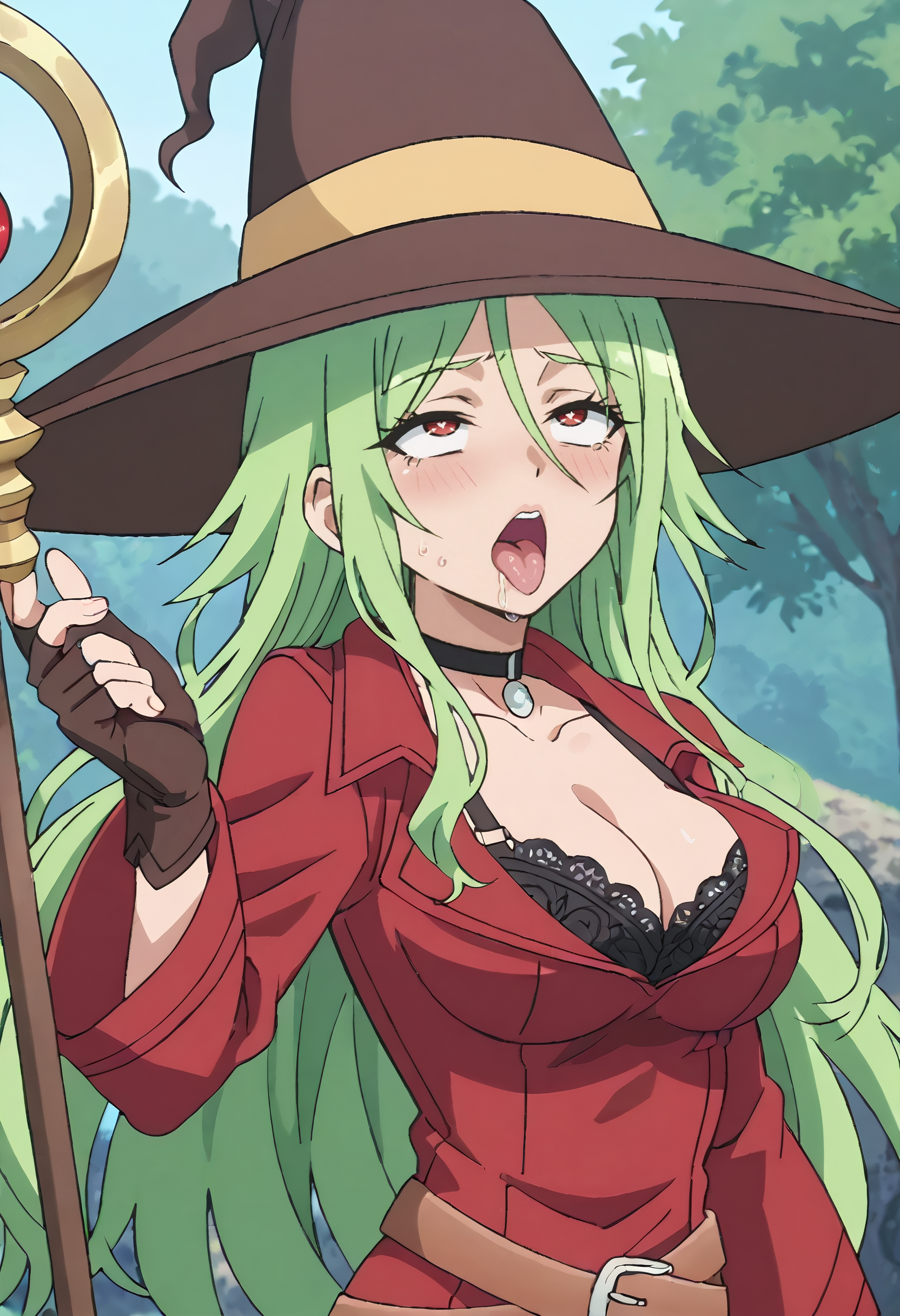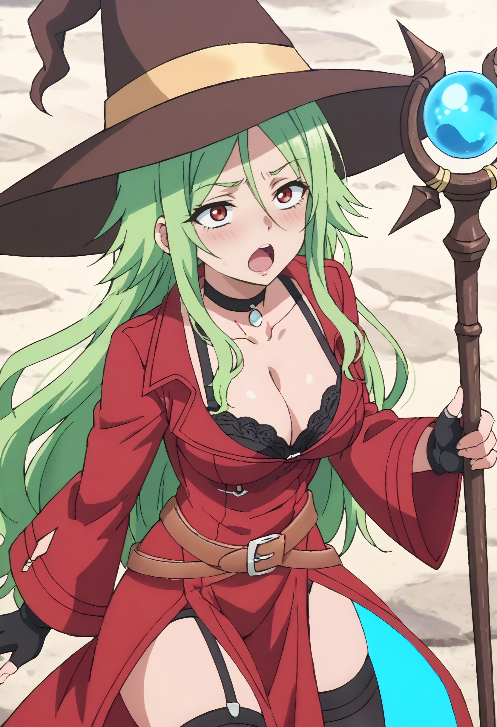 MimosaOutfit、帽子、魔女帽、魔女、チョーカー、胸元、長袖、手袋、黒い手袋、黒いチョーカー、ベルト、ドレス、赤いドレス、指なし手袋、ジャケット、赤いジャケット、ブーツ、黒いブラ、ブラ、赤い靴、太もも長靴、黒い太もも長靴、茶色のベルト、広い袖、サイドスリット、