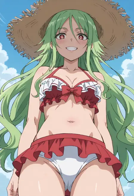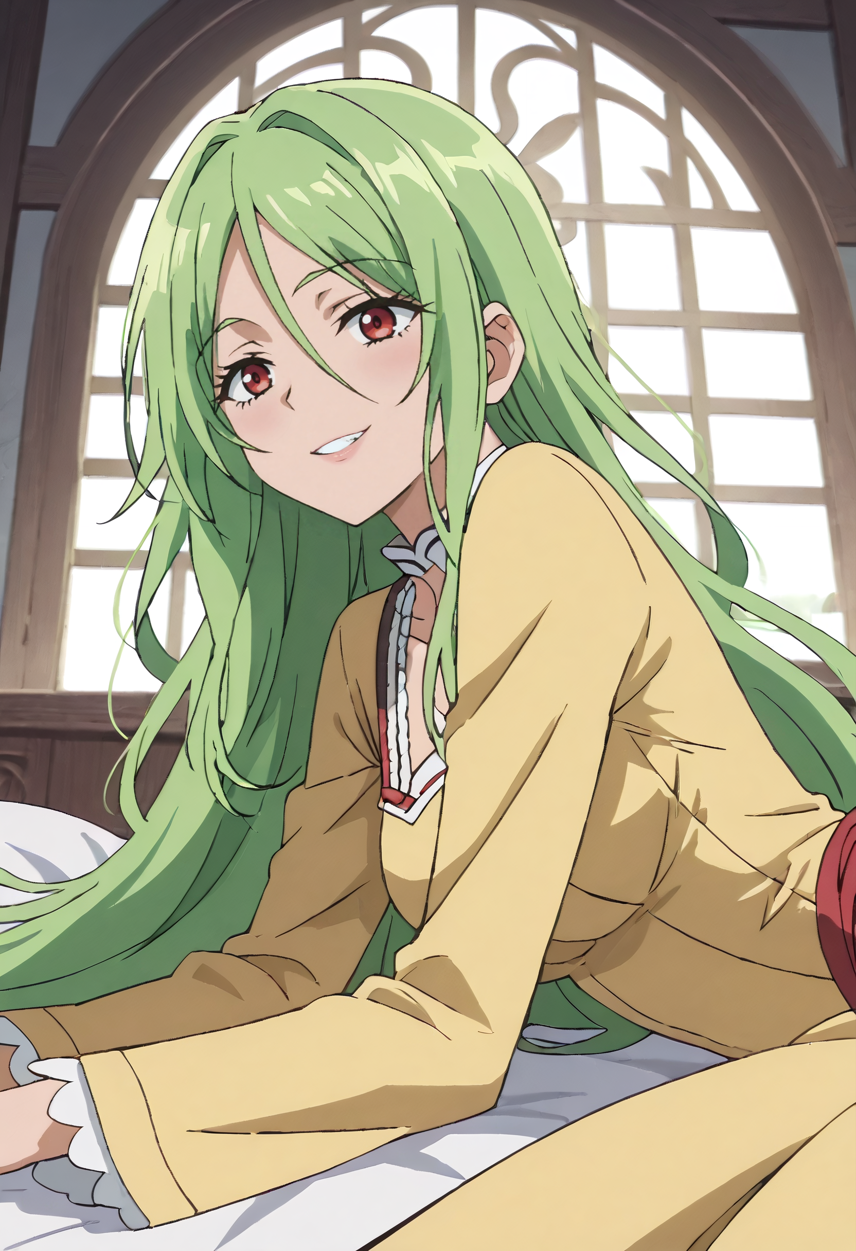 MOKMimosa、緑の髪、長い髪、赤い目、目の間の髪、非常に長い髪