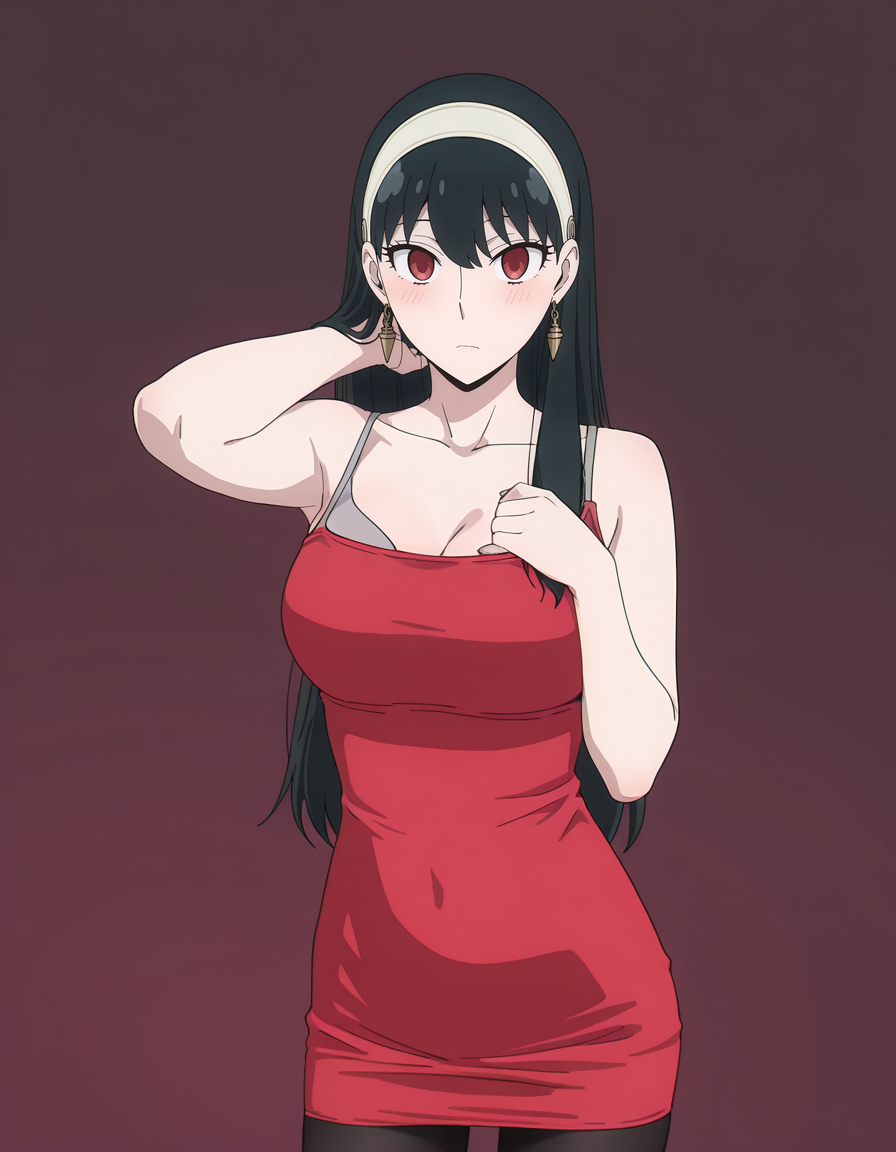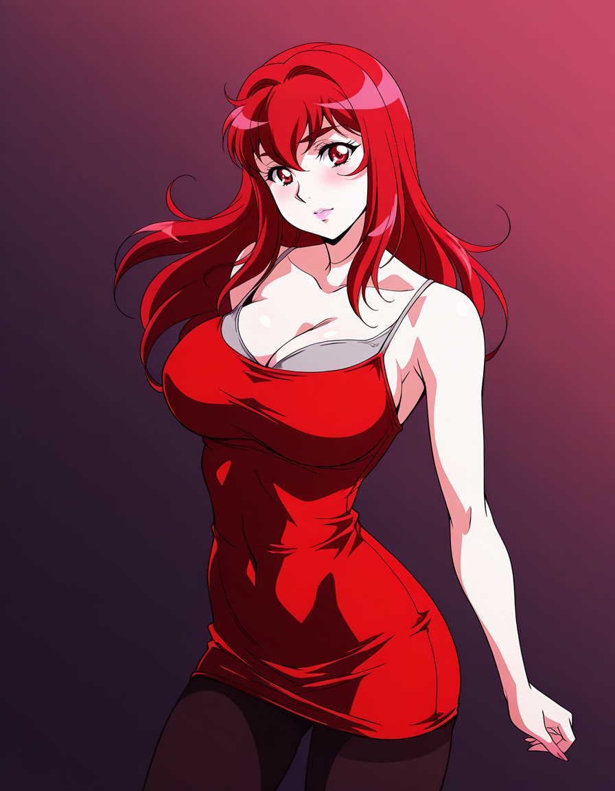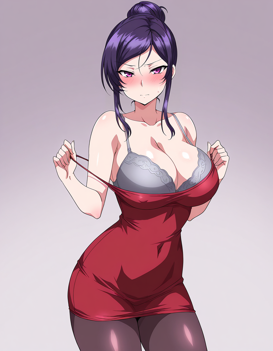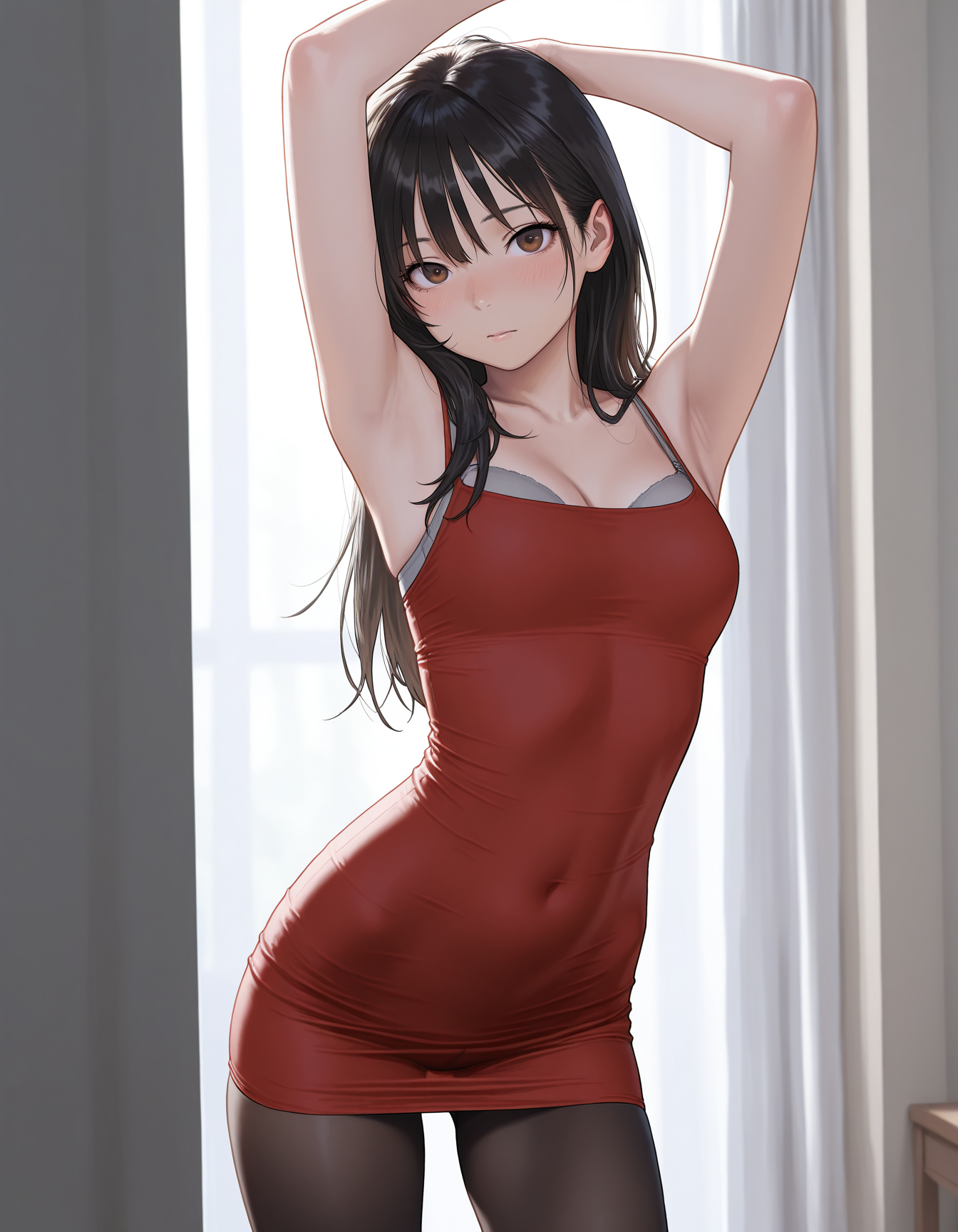 mai_rbdress,grey_bra,sleeveless_dress,tight_dress,red_dress,black_pantyhose