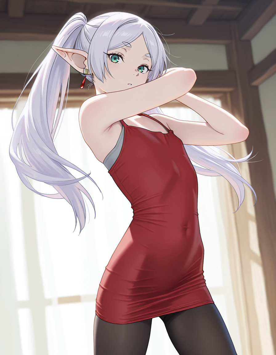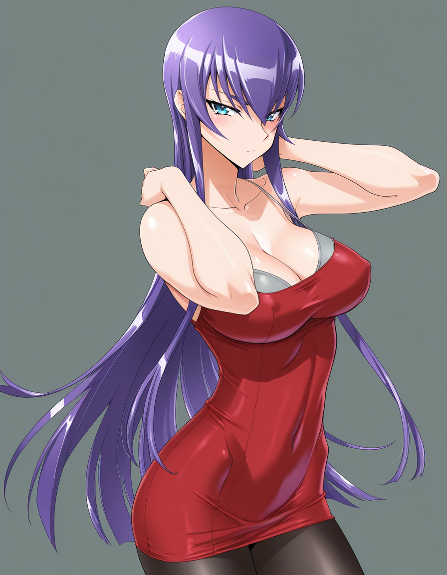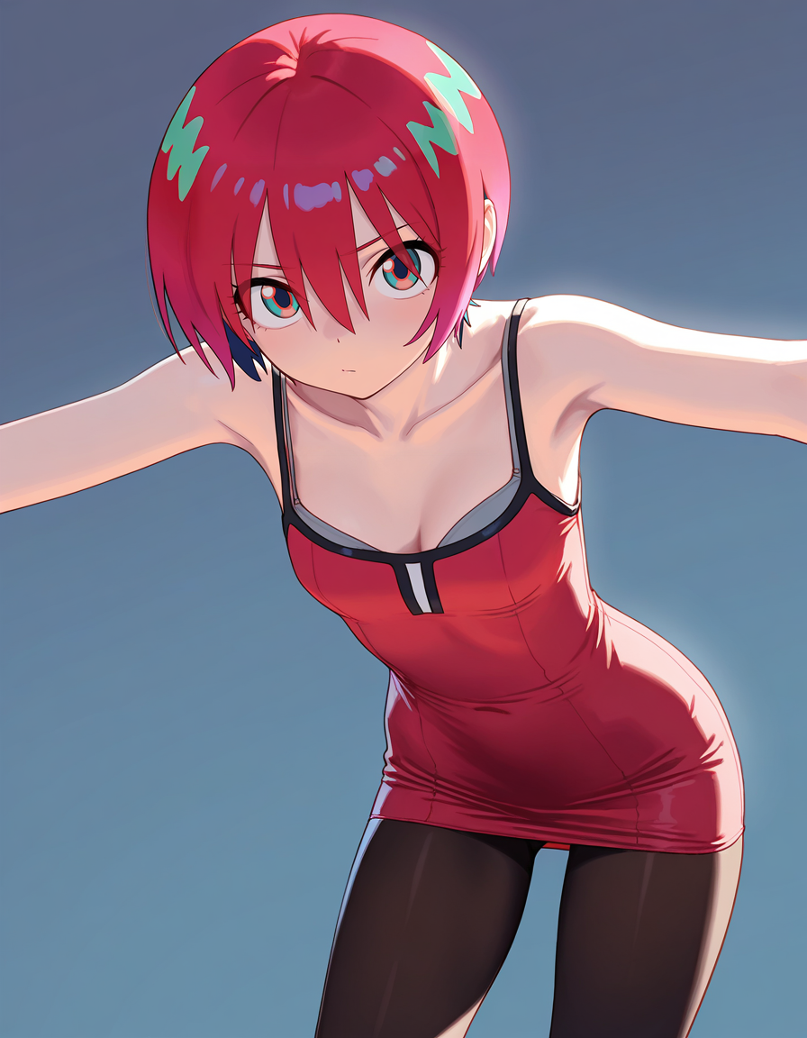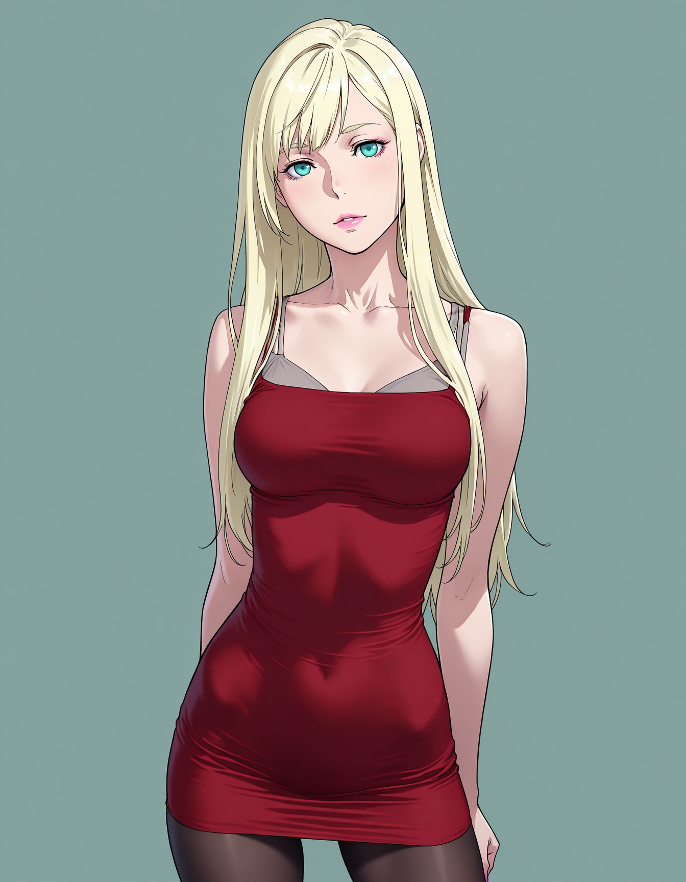 mai_rbdress,grey_bra,sleeveless_dress,tight_dress,red_dress,black_pantyhose