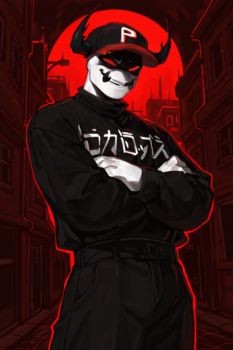 useful tags:pestregret, white skin, red eyes, black baseball cap, black horns, shaded face, black fangs, black written shirt with long sleeves, black pants, evil grin,