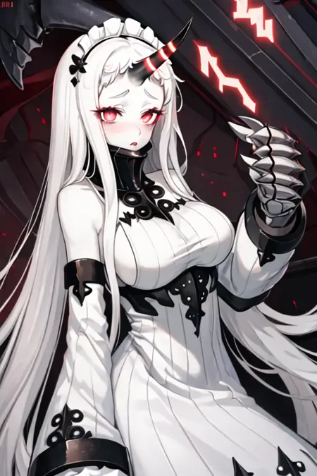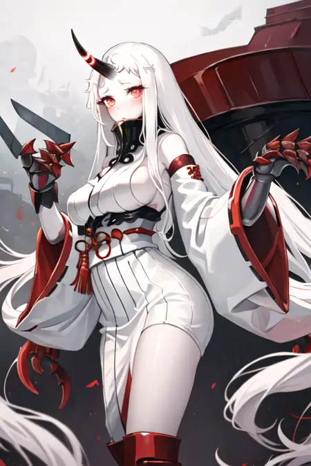 The trigger word is seaport_hime_kantaicollection, and the recommended tags are best quality, masterpiece, highres, solo, {seaport_hime_kantaicollection:1.15}, abyssal_ship, horns, long_hair, single_horn, white_hair, red_eyes, pale_skin, breasts, large_breasts, claws, very_long_hair, blush, colored_skin, white_skin.
