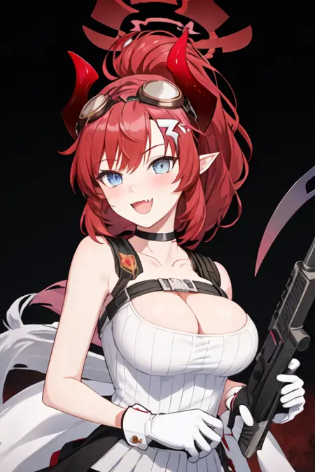 The trigger word is megu_bluearchive, and the pruned tags are red_hair, horns, breasts, demon_horns, long_hair, blue_eyes, ponytail, large_breasts, halo, pointy_ears, hair_ornament, red_horns, tail, demon_tail, goggles_on_head, fang. When some features (e.g. hair color) are not so stable at some times, you can add these them into your prompt.