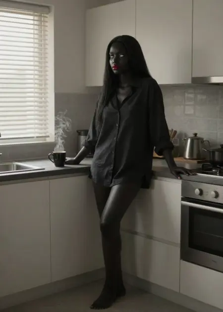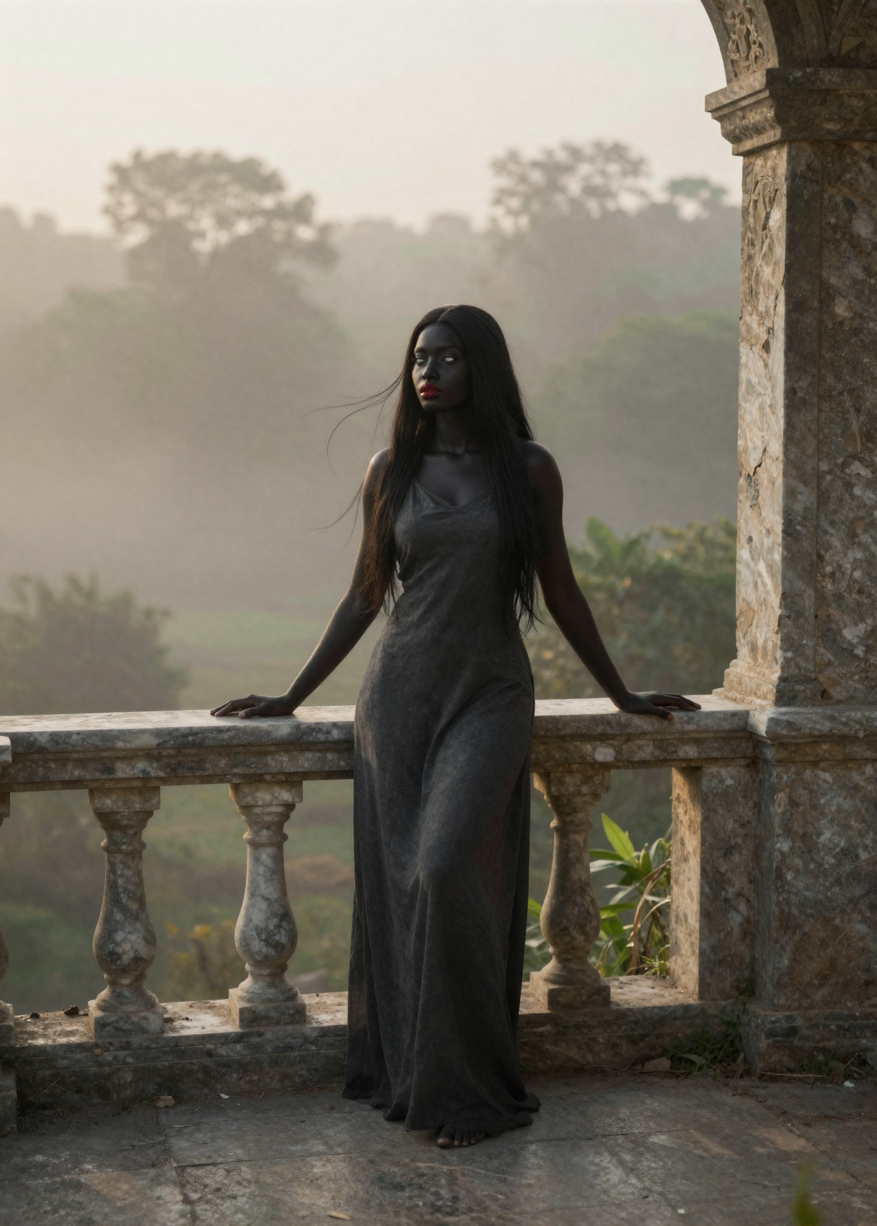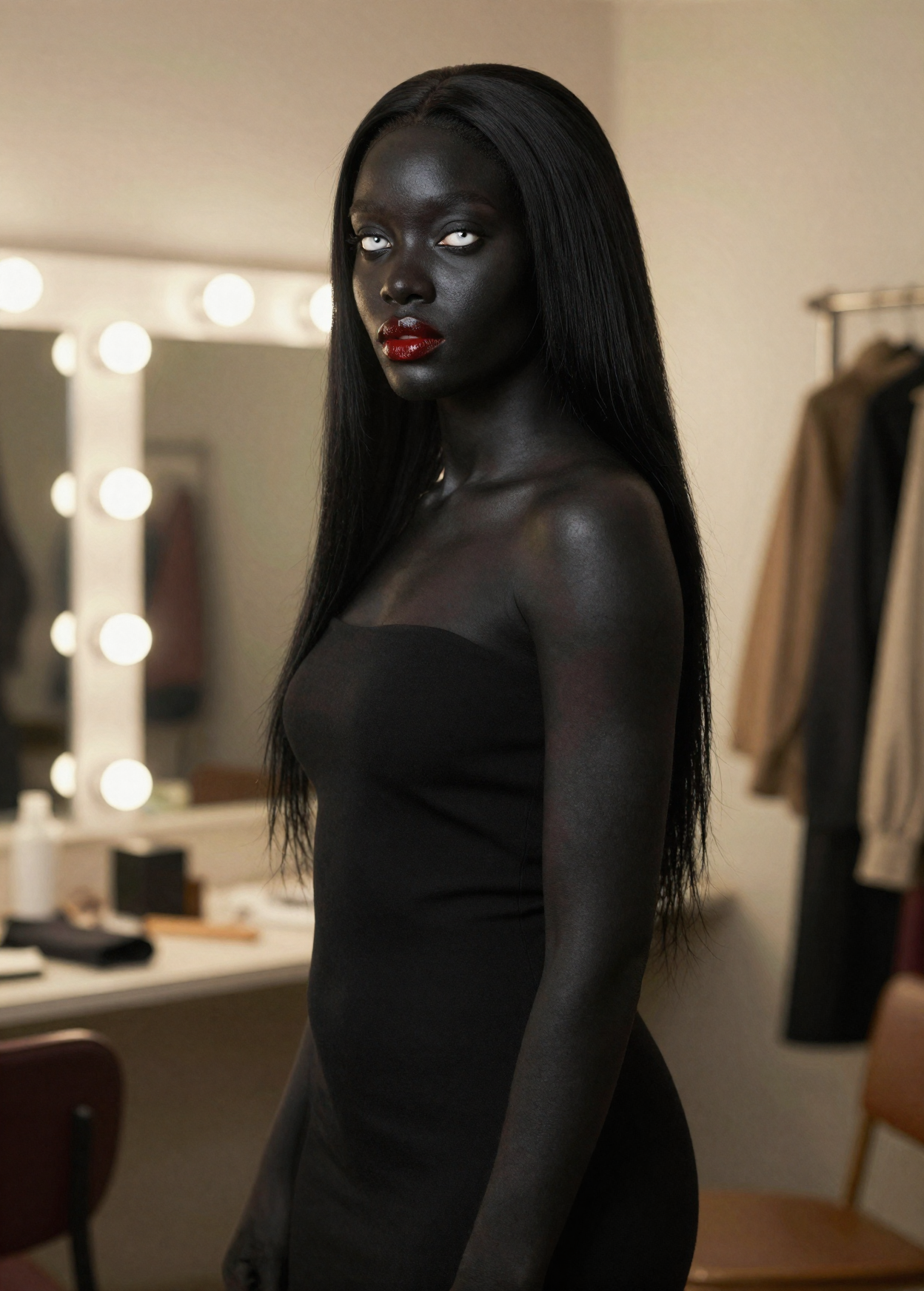 このキャラクターLoRAは、過剰メラニン色素沈着、長いまっすぐな黒髪、白い虹彩、濃い赤のリップスティックを持つ女性を表しています。