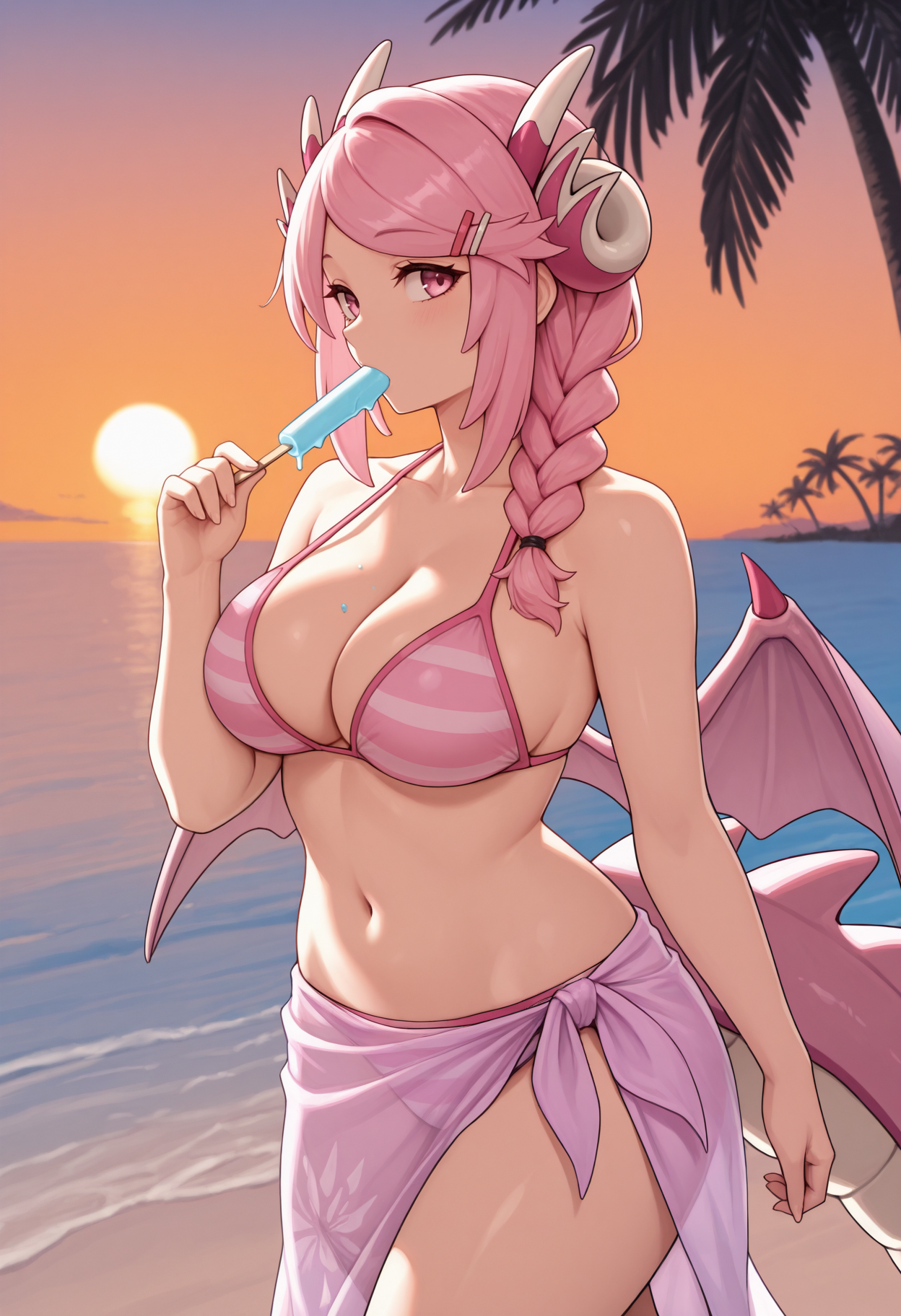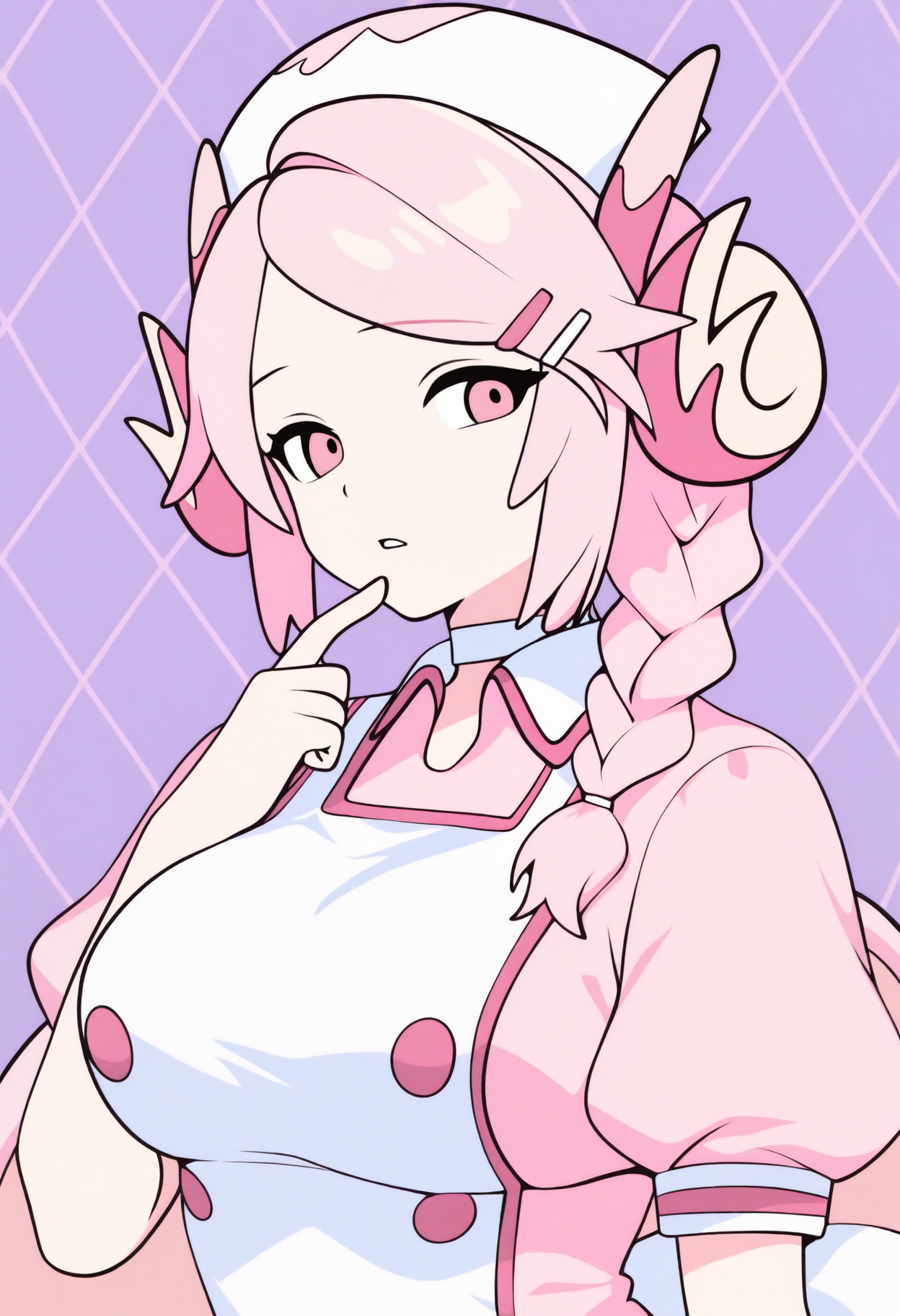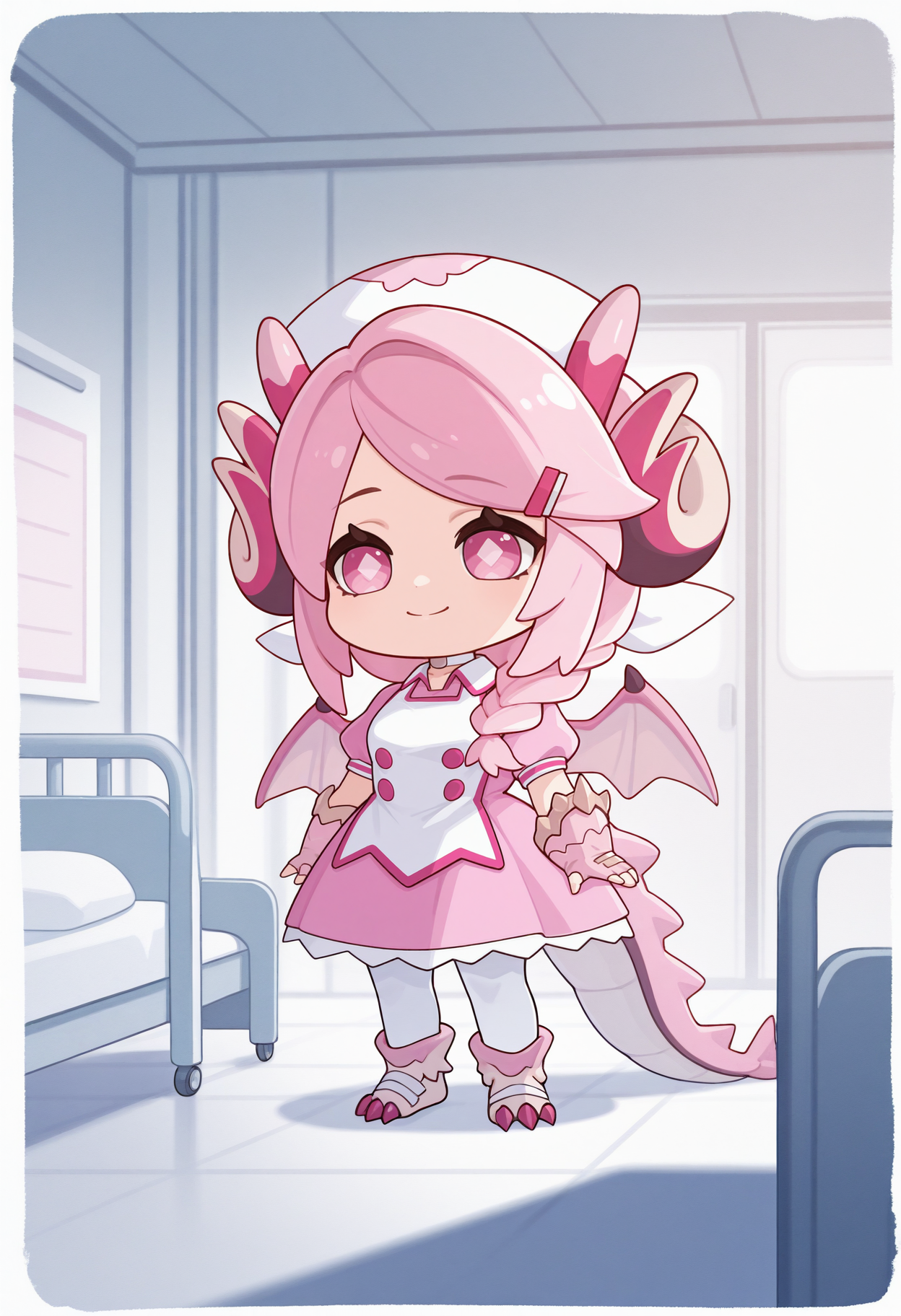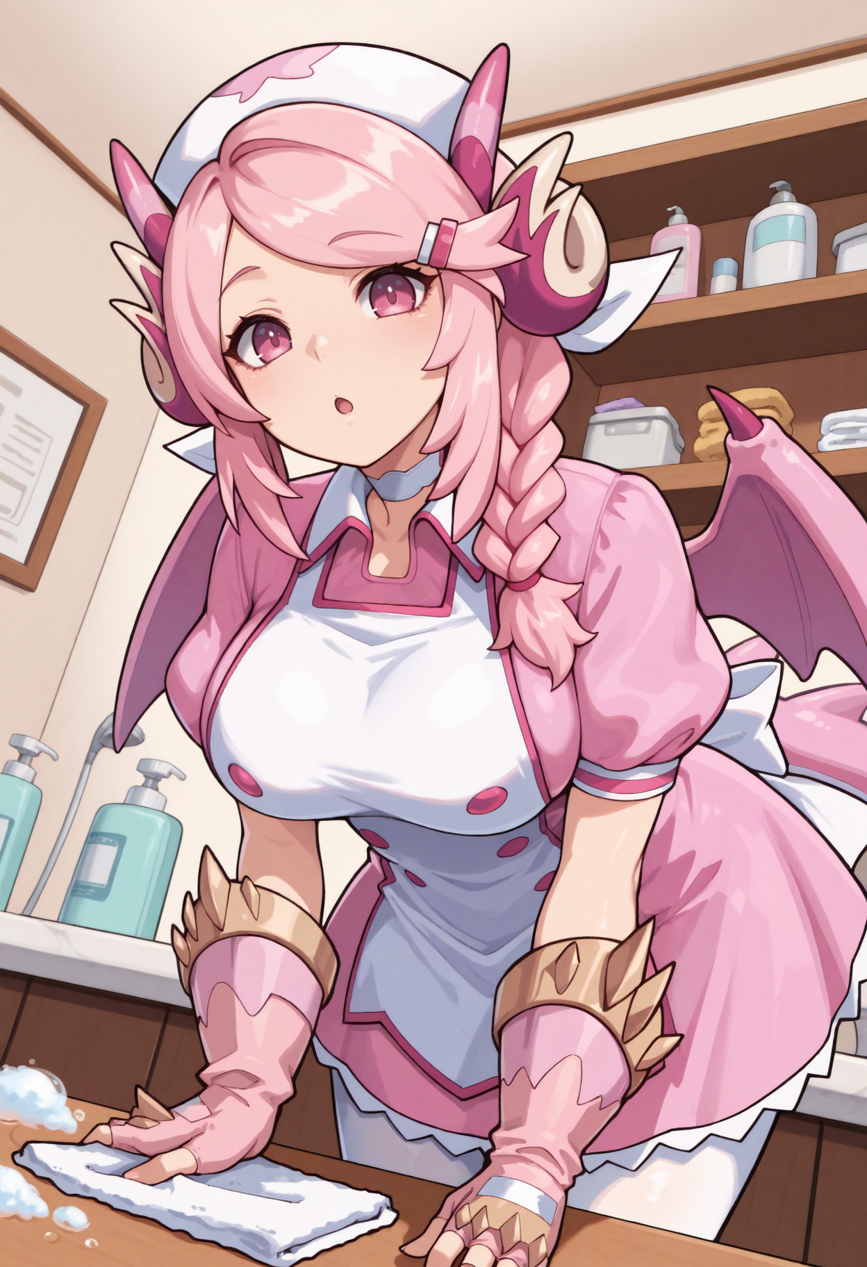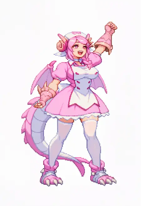 デフォルトの外見: ピンクの髪、看護師の帽子、ドラゴンの角、流れた前髪、ヘアクリップ、ピンクの目、一本の編み髪、長い髪、白いチョーカー、ピンクのドレス、カラー付きドレス、白いエプロン、ふくらはぎの短い袖、ガントレット、ピンクの手袋、指なし手袋、ドラゴンの翼、ピンクの翼、ドラゴンの尾、白いパンティーストッキング