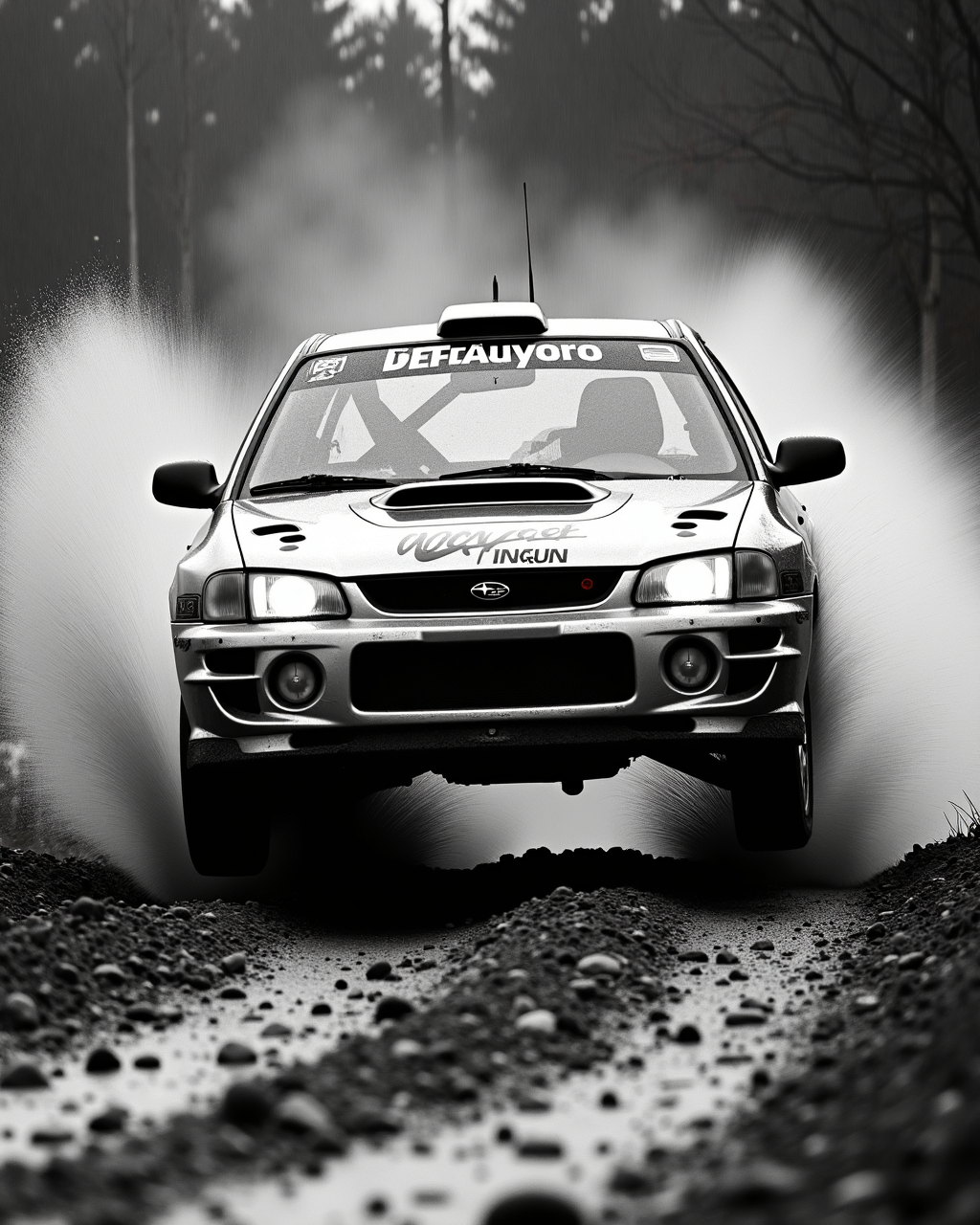 z00m 白黒写真、汚れた山道を駆け抜けるラリー選手たちが、放射状のズームブラー、舞い上がる塵の雲、崖が切り立つ中を疾走、低角度