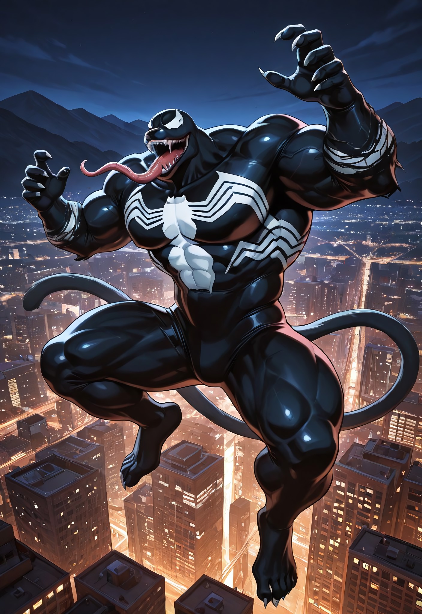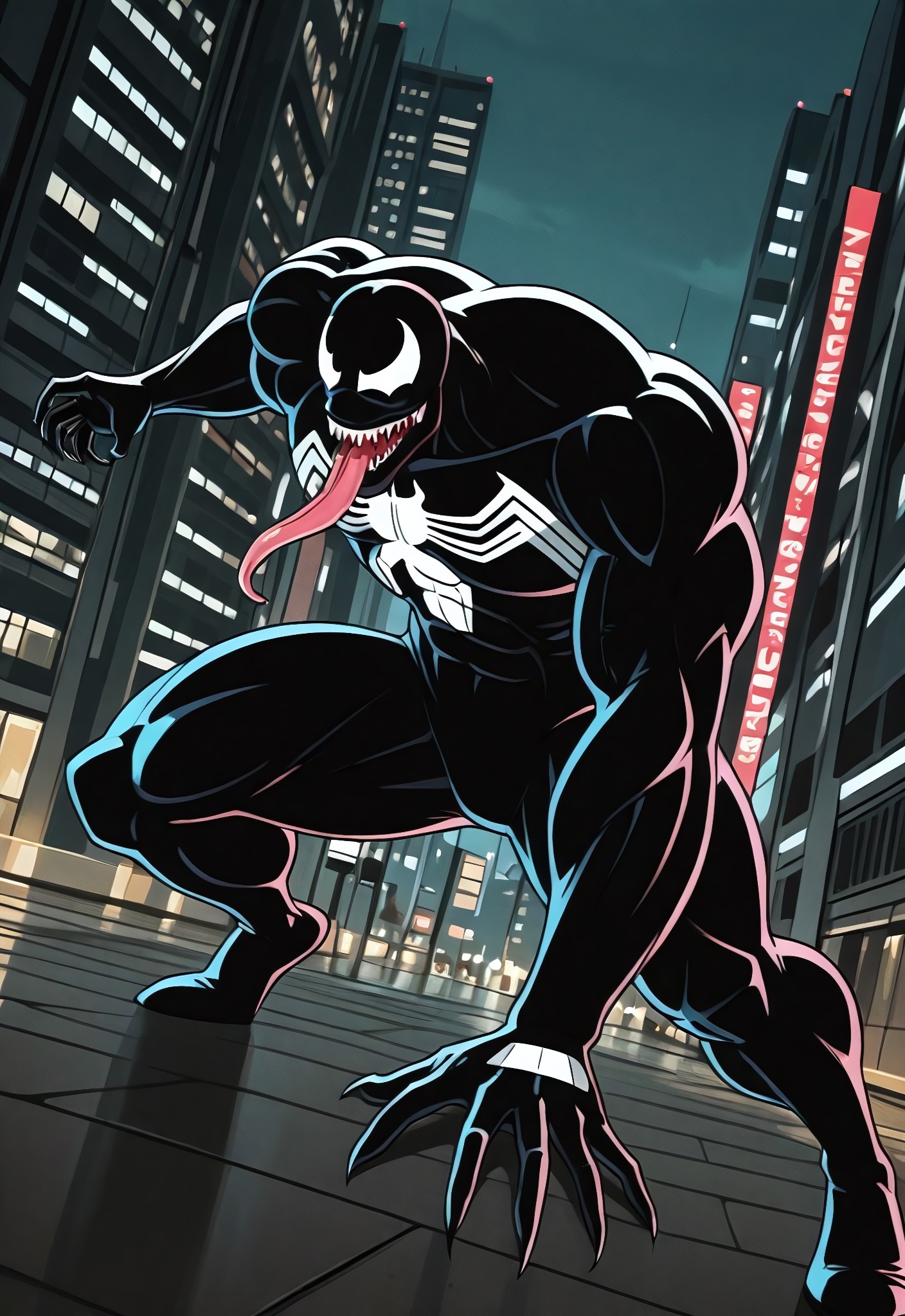 venom1994_(animatedseries)IL, symbiote, black suit, body suit, spider print, monsterboy, 1boy, solo, muscular, claws, mouth, sharp teeth, long tongue, big muscles, big pecs, pecs, large pectorals, huge muscles, huge pecs, mature male,