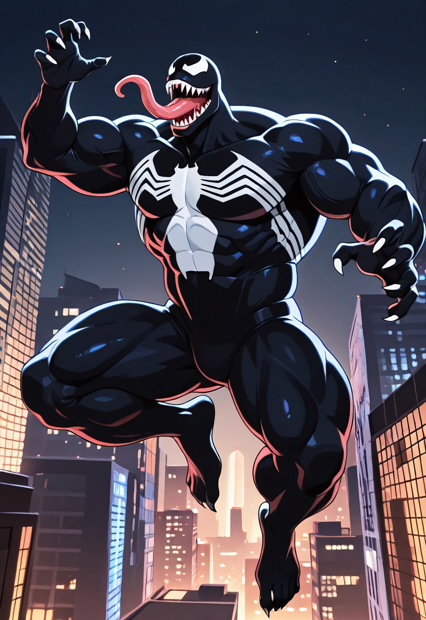 venom1994_(animatedseries)XL, symbiote, black suit, body suit, spider print, monsterboy, 1boy, solo, muscular, claws, mouth, sharp teeth, long tongue, big muscles, big pecs, pecs, large pectorals, huge muscles, huge pecs, mature male,