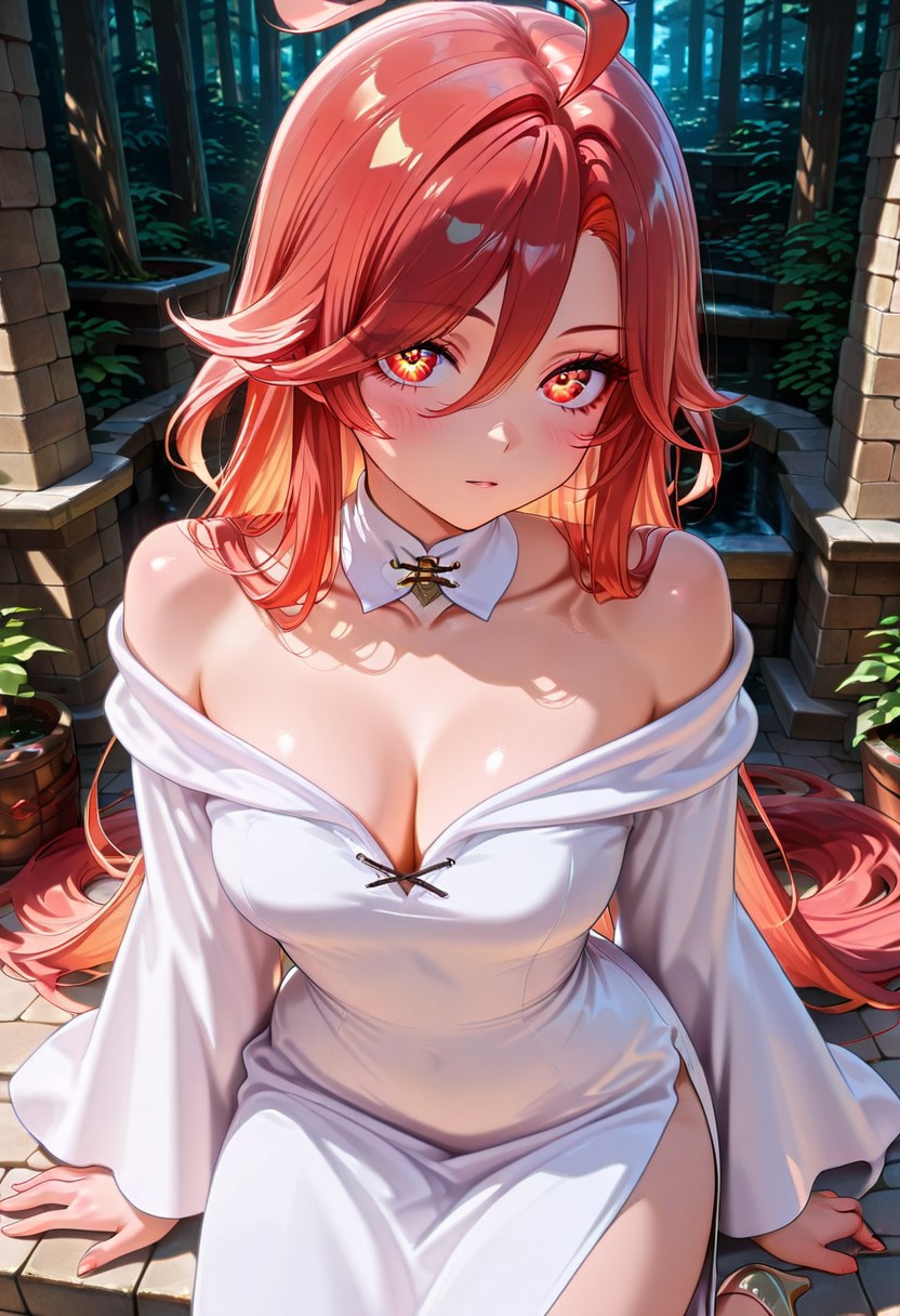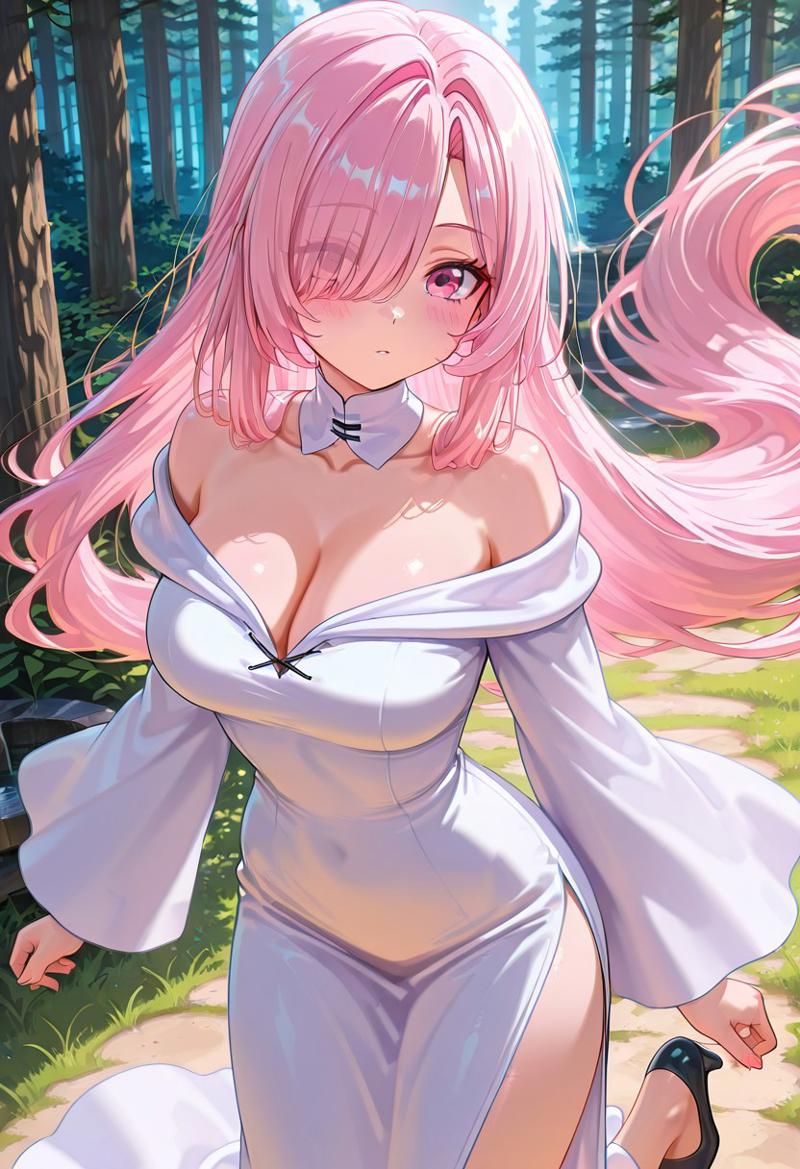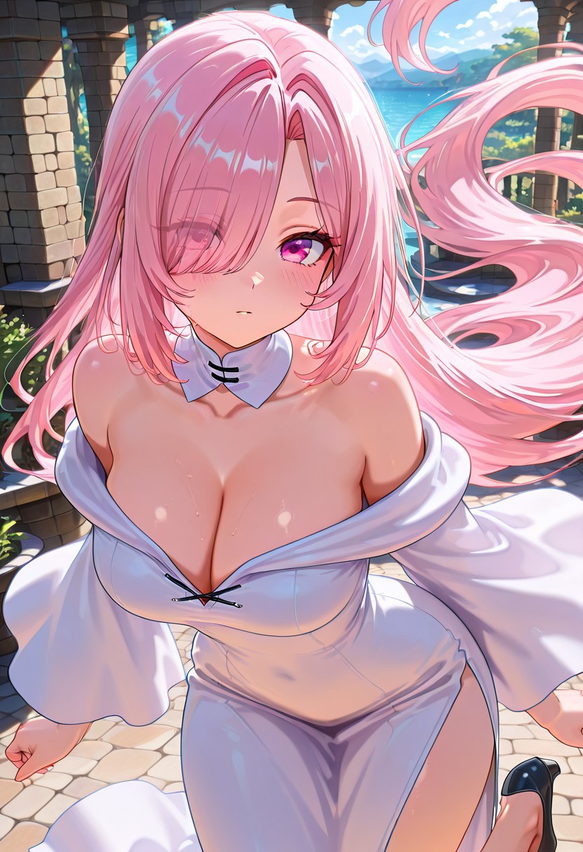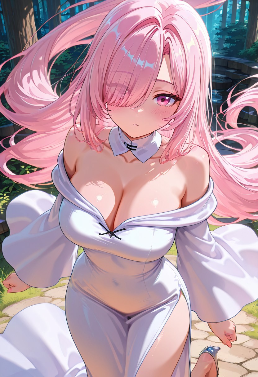 tliaclstyl,detached collar,bare shoulders,collarbone,cleavage,off-shoulder dress,white dress,long dress,wide sleeves,long sleeves,side slit,high heels,