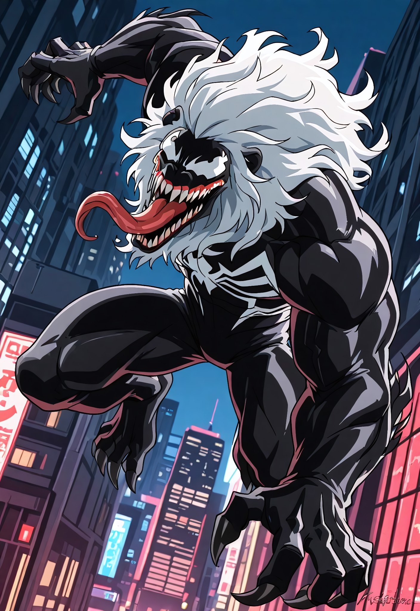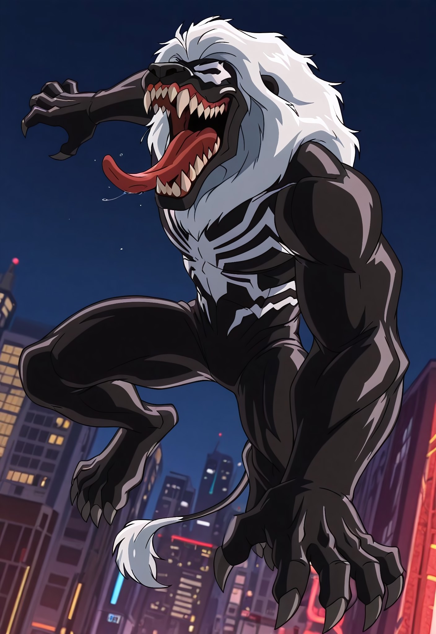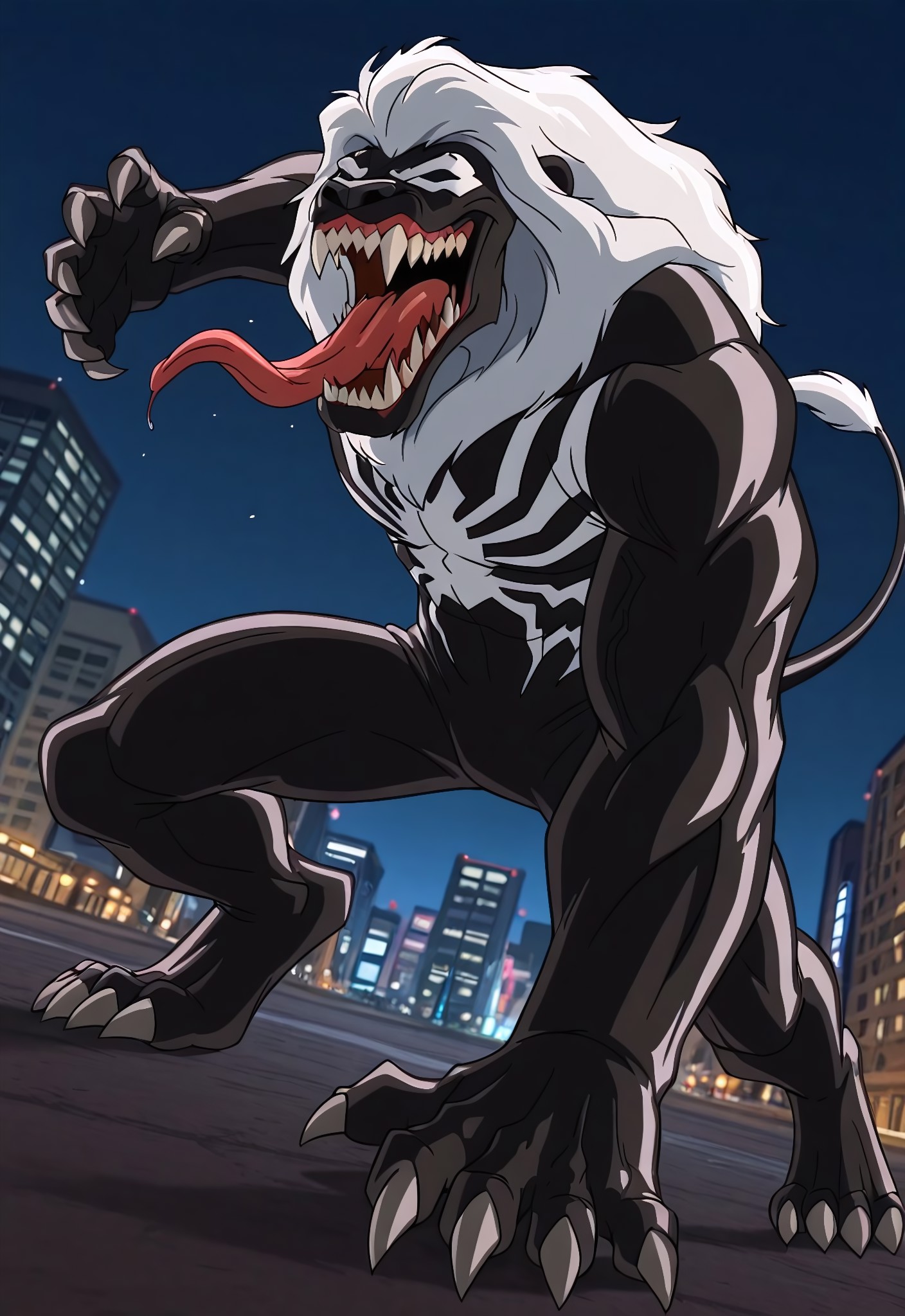 kravenultimate_venom(animated)XL, lion, symbiote, body suit, black suit, white mane, white hair, lion ears, monsterboy, 1boy, solo, muscular, mouth, sharp teeth, long tongue, claws, feet,