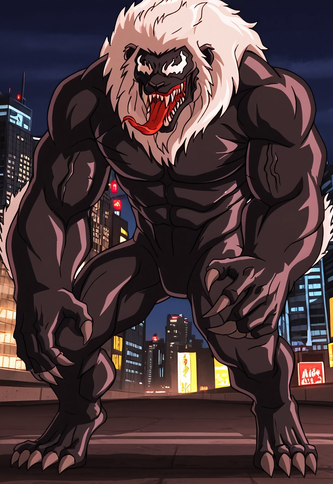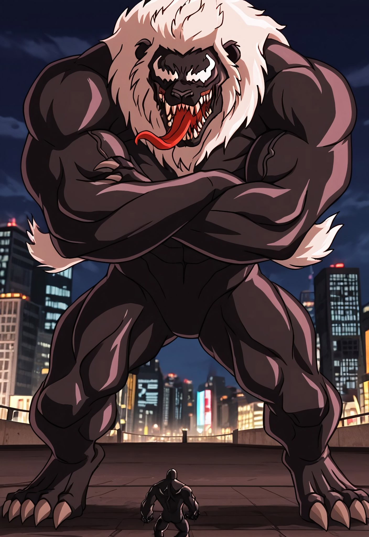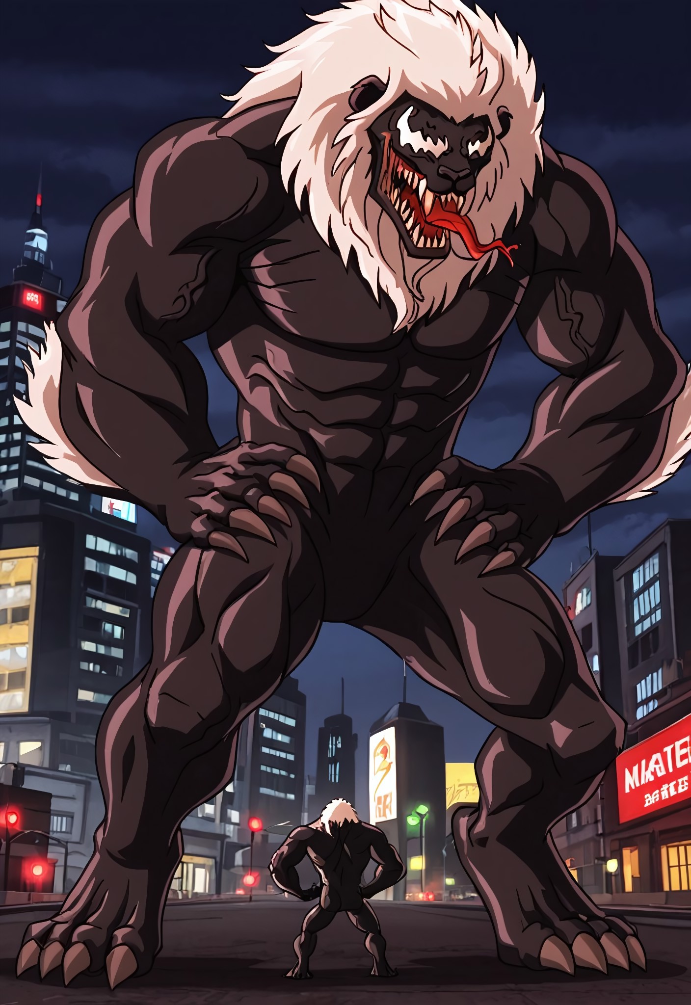 kravenultimate_venom(animated)XL, lion, symbiote, body suit, black suit, white mane, white hair, lion ears, monsterboy, 1boy, solo, muscular, mouth, sharp teeth, long tongue, claws, feet,
