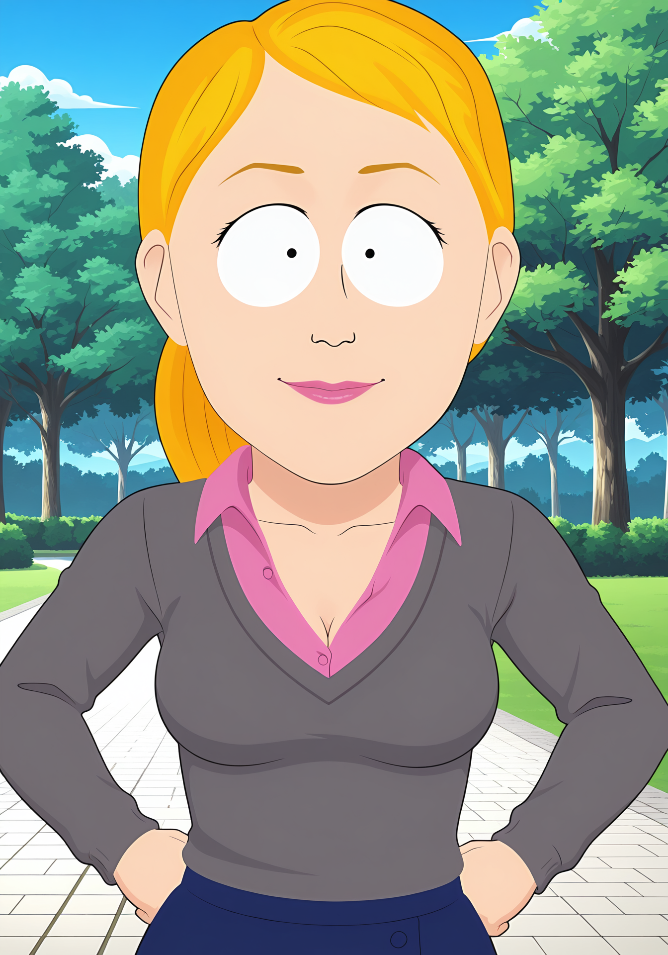 blonde hair, long hair, ponytail, lips, lipstick, black eyes