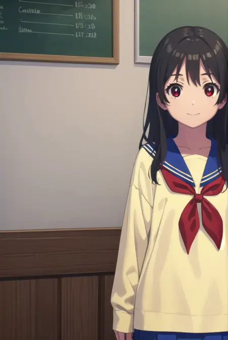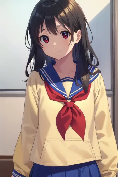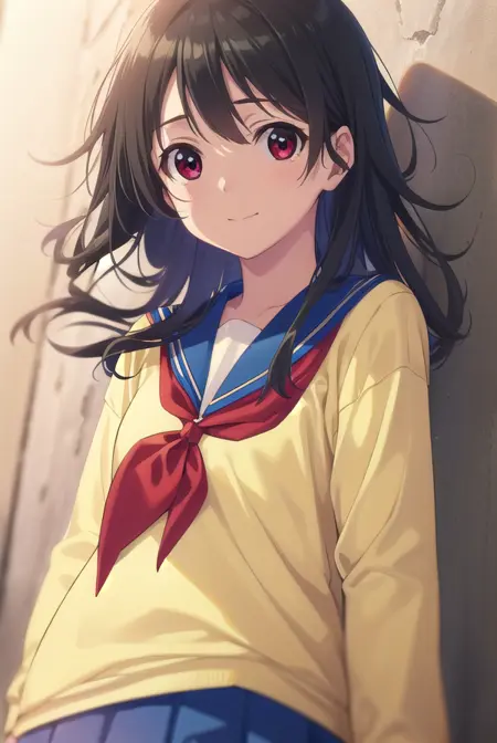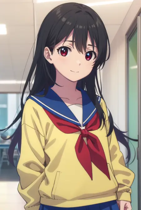skirt, school uniform, serafuku, blue sailor collar, shirt, (light yellow shirt:1.5), long sleeves, blue skirt, neckerchief, (red neckerchief:1.5),