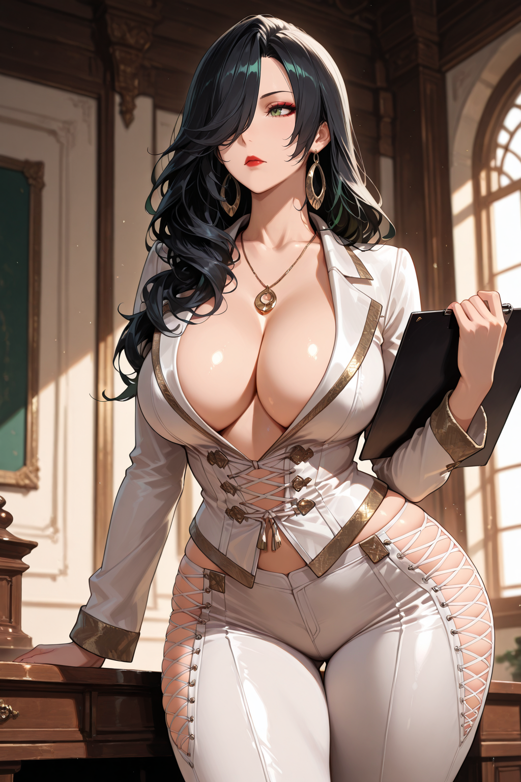 hoop earrings, white jacket, long sleeves, necklace, no bra, cleavage, cross-laced clothes, white pants, hip vent