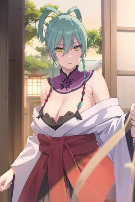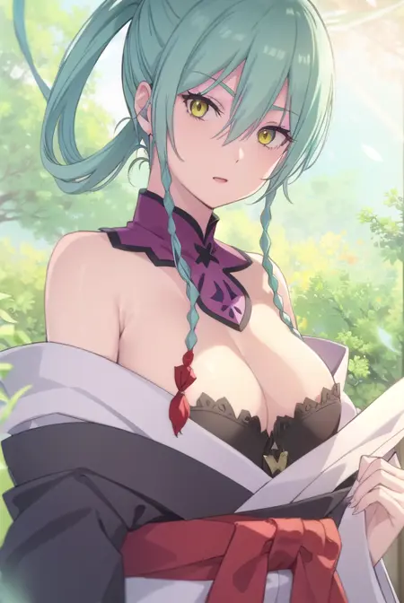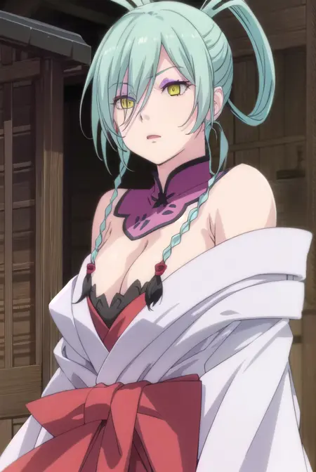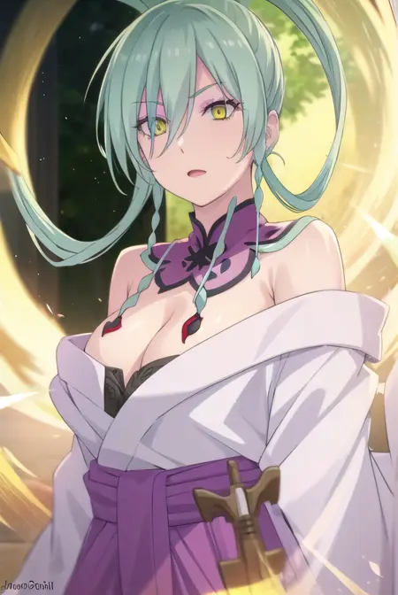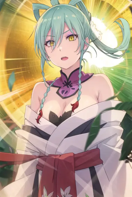 kamu oichi hime, バレッタ, 緑の髪, 二重の編み込み, 水色の髪, メイク, リップスティック, ヘアリング, (黄色い目:1.3),