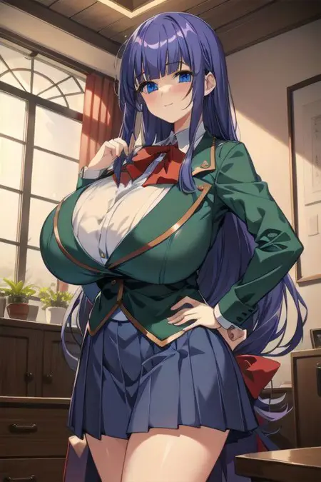Fuutou Shizune, blue hair, Blunt Bangs, Side hair, Waist Length, blue eyes, Huge Breasts, Gigantic breasts, Pale skin, Slim, saggy breasts, school uniform, green jacket, white shirt, blue tie, skirt, red skirt, white tights