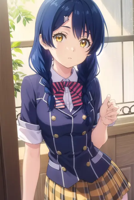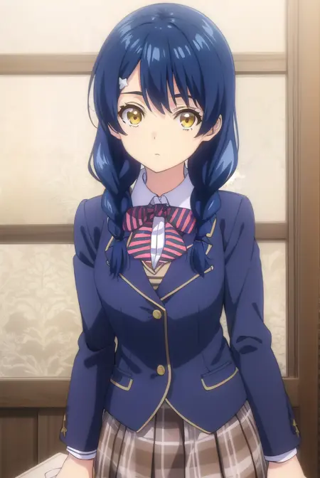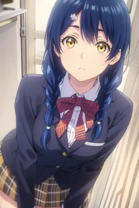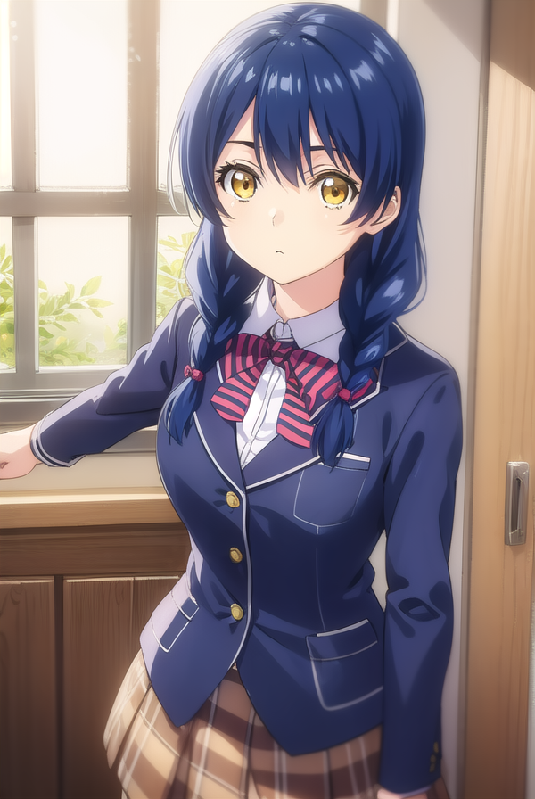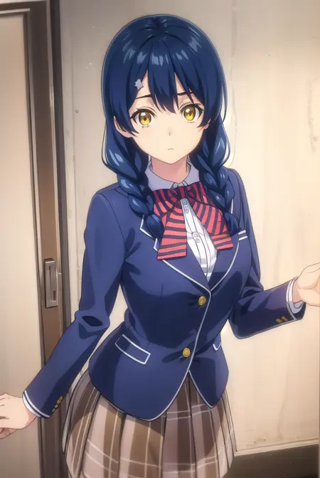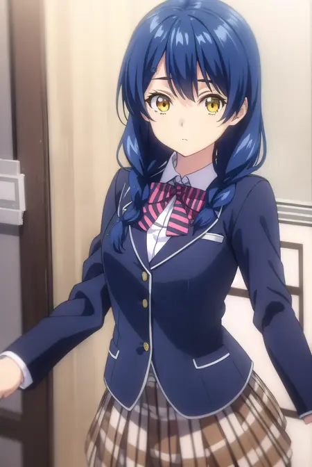 bow, school uniform, striped, bowtie, blazer, striped bowtie, blue blazer, brown skirt, plaid skirt, plaid,