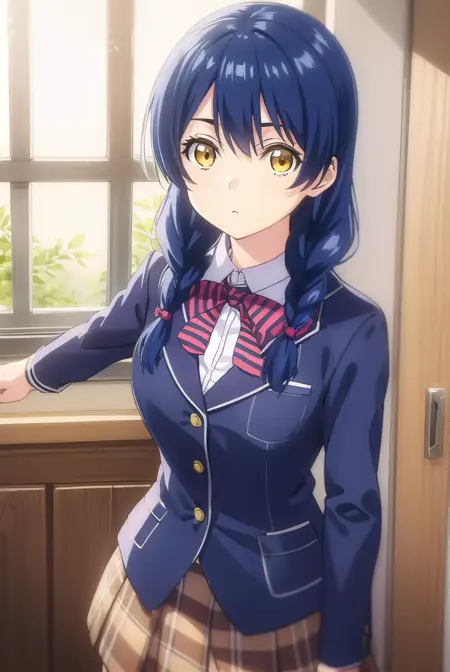 リボン、学ラン、ストライプ、ネクタイ、ブレザー、ストライプネクタイ、青いブレザー、茶色のスカート、チェック柄スカート、チェック、