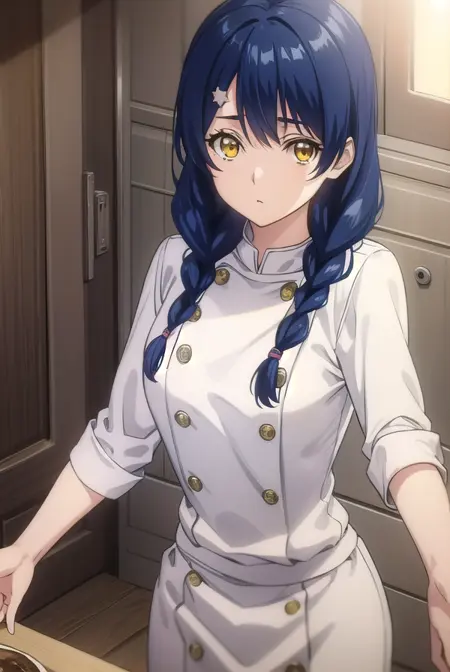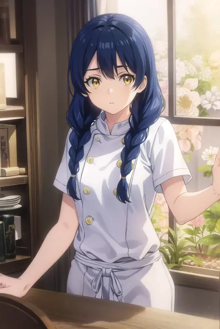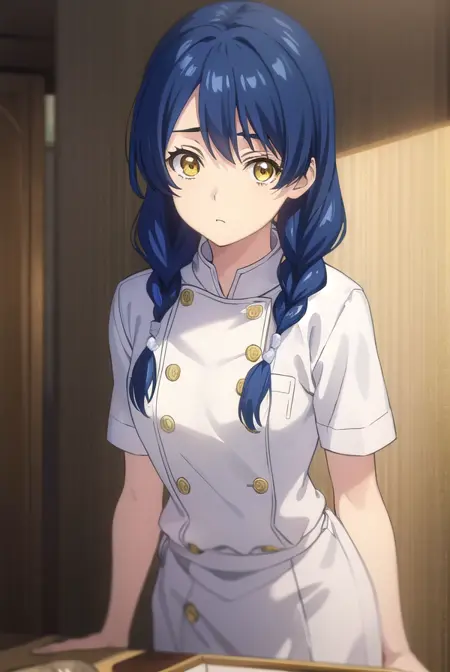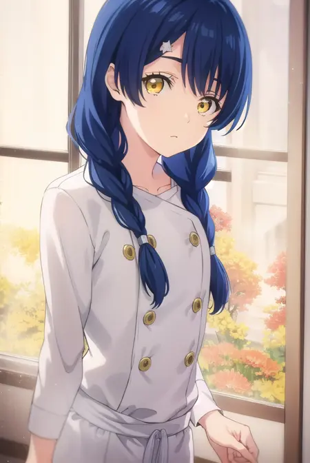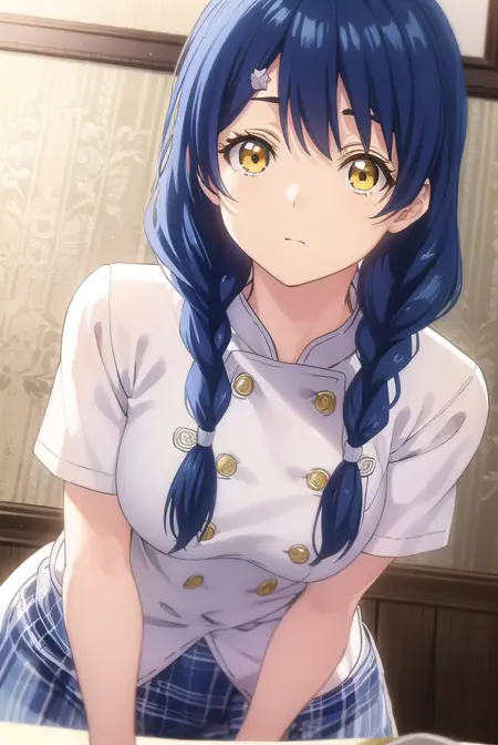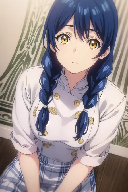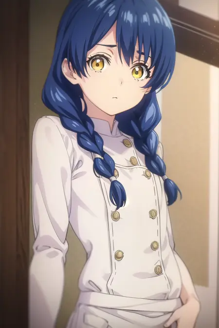 megumi tadokoro, long hair, blue hair, (yellow eyes:1.3), braid, twin braids,
