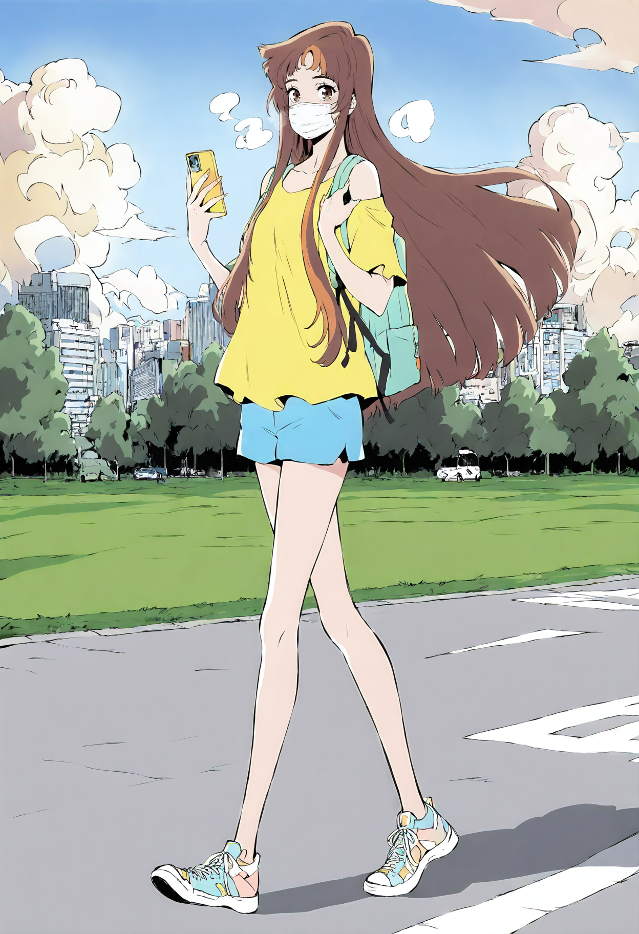 1girl、茶色の目、茶色の髪、オレンジの髪、複色の髪、ツートーンヘア、ストライプヘア、前髪、まっすぐな前髪、長い髪、非常に長い髪、側面の髪、口元マスク、外科用マスク