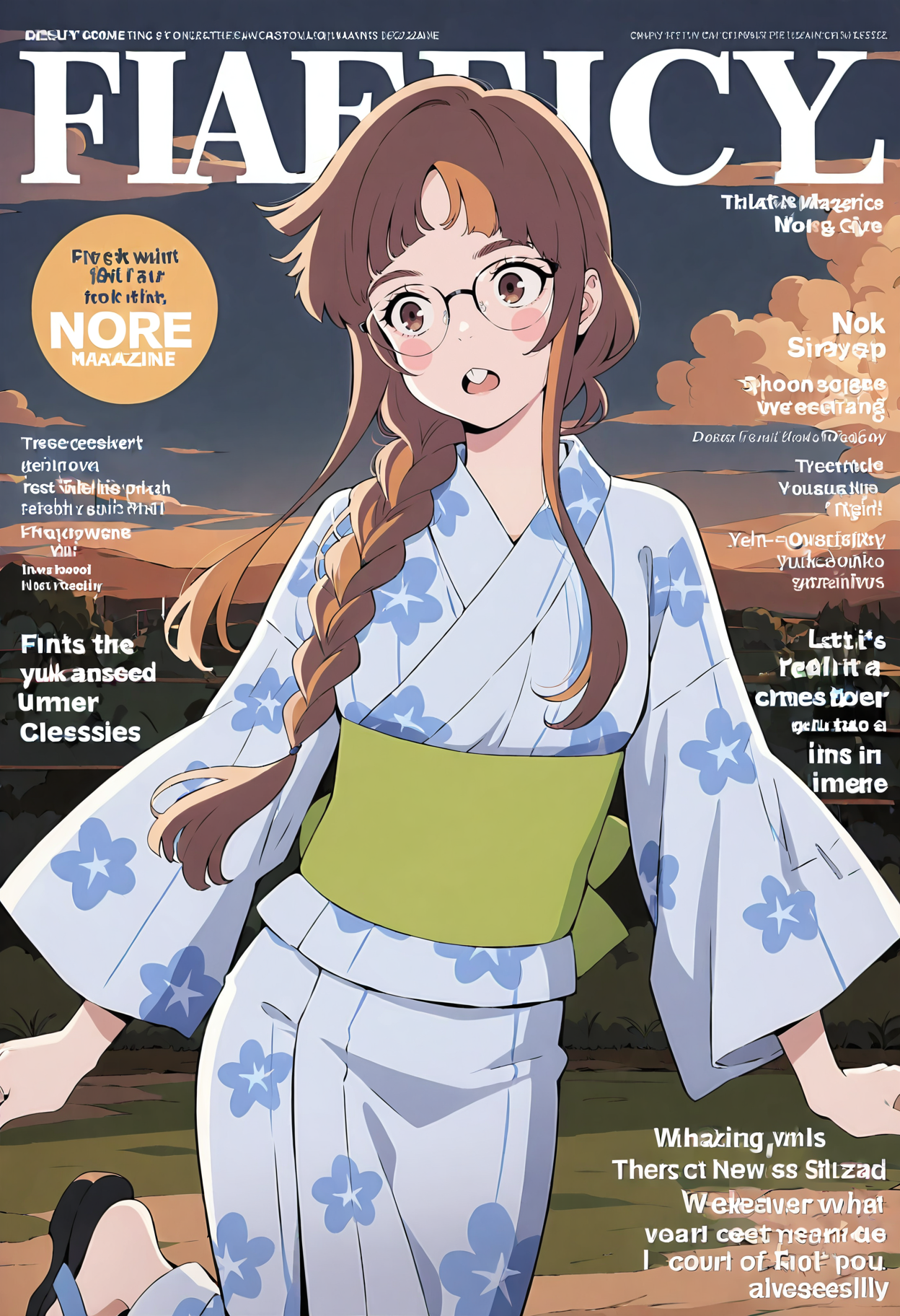 編み髪、一本編み髪、編み込みポニーテール、髪飾り、和服、着物、浴衣、花柄、帯、長い袖、下駄、帯、広い袖