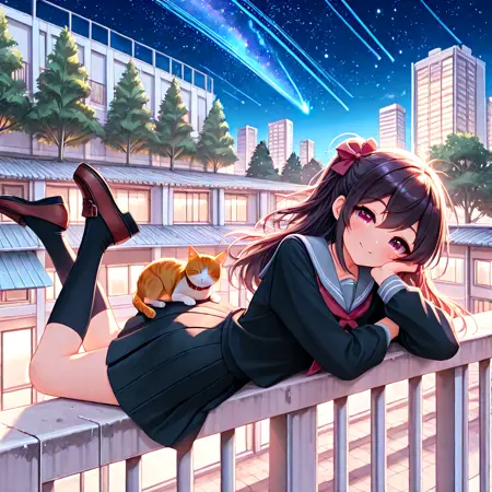 | 训练词汇 | absurdres, sensitive, school railings, overlooking, corridor, porch, 1girl, smile, long hair, serafuku, sailor collar, school uniform, red neckerchief, black shirt, black skirt, pleated skirt, kneehighs, loafers, building, wind, city, tree, sky, cat,已复制! standing, head rest, from side,已复制! facing viewer, symmetry,已复制! against railing, leaning back,已复制! vending machine, holding can,已复制! |