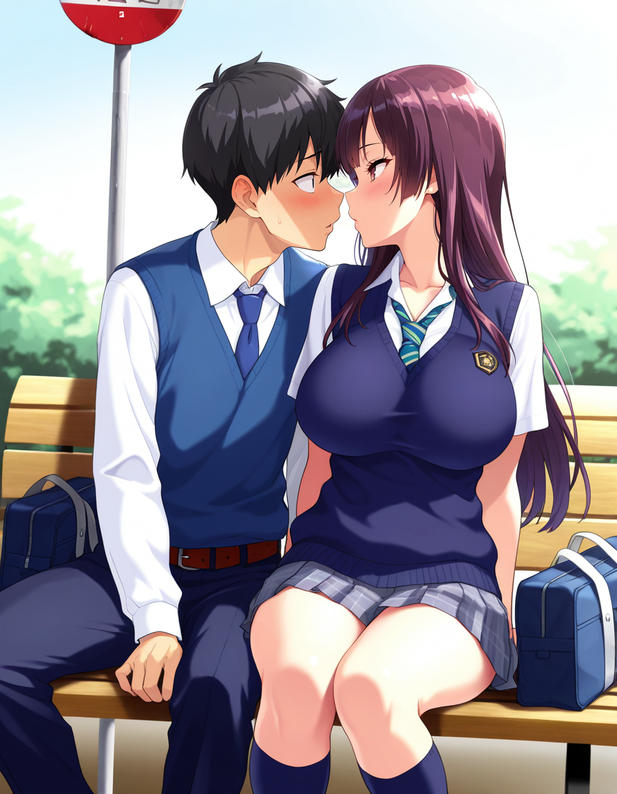 mai_natsuhaa,long_hair,purple_hair,red_eyes,hairclip,school_uniform,bowtie,white_shirt,short_sleeves,black_sweater_vest,grey_pleated_skirt,black_kneehighs,loafers