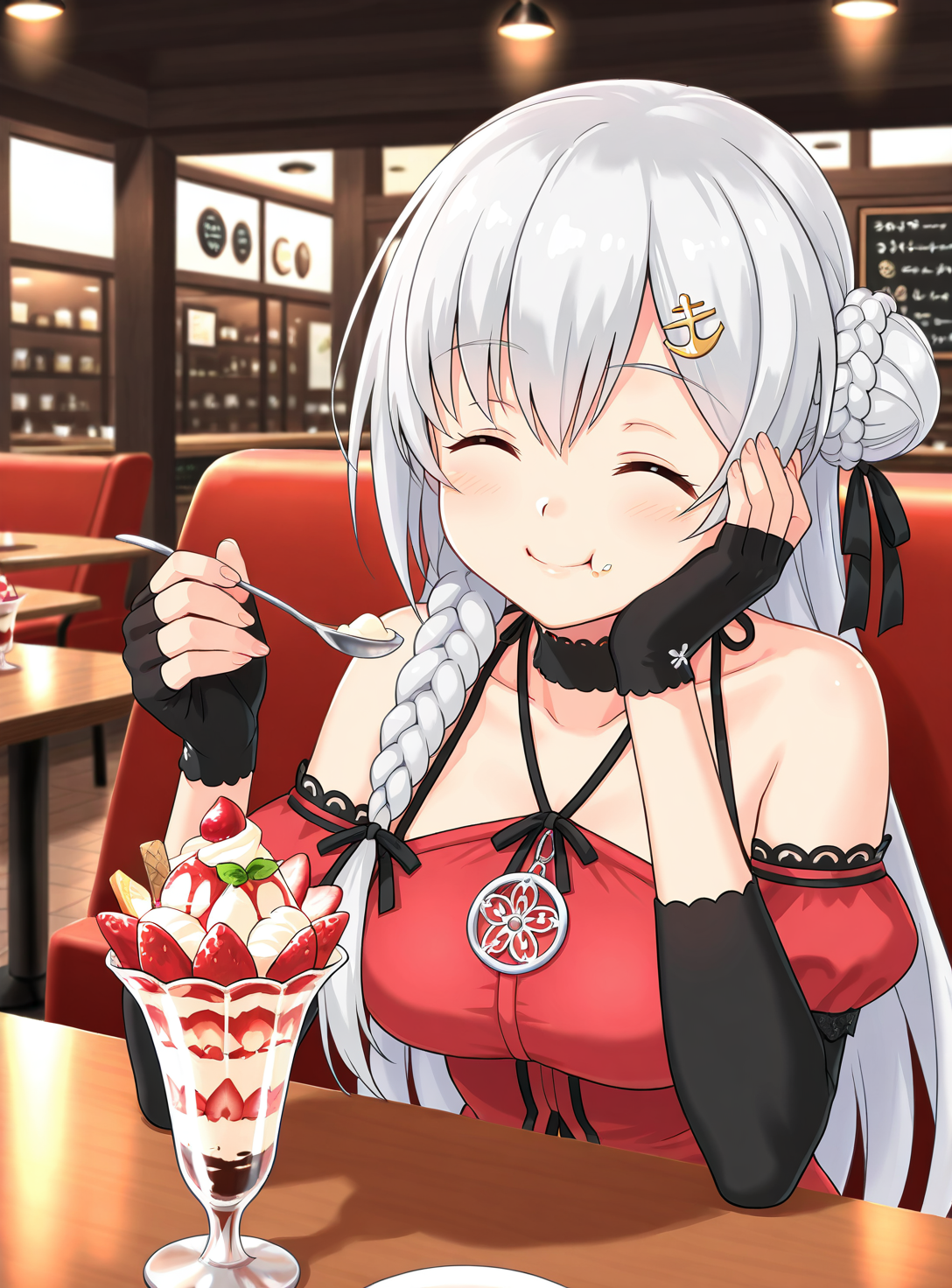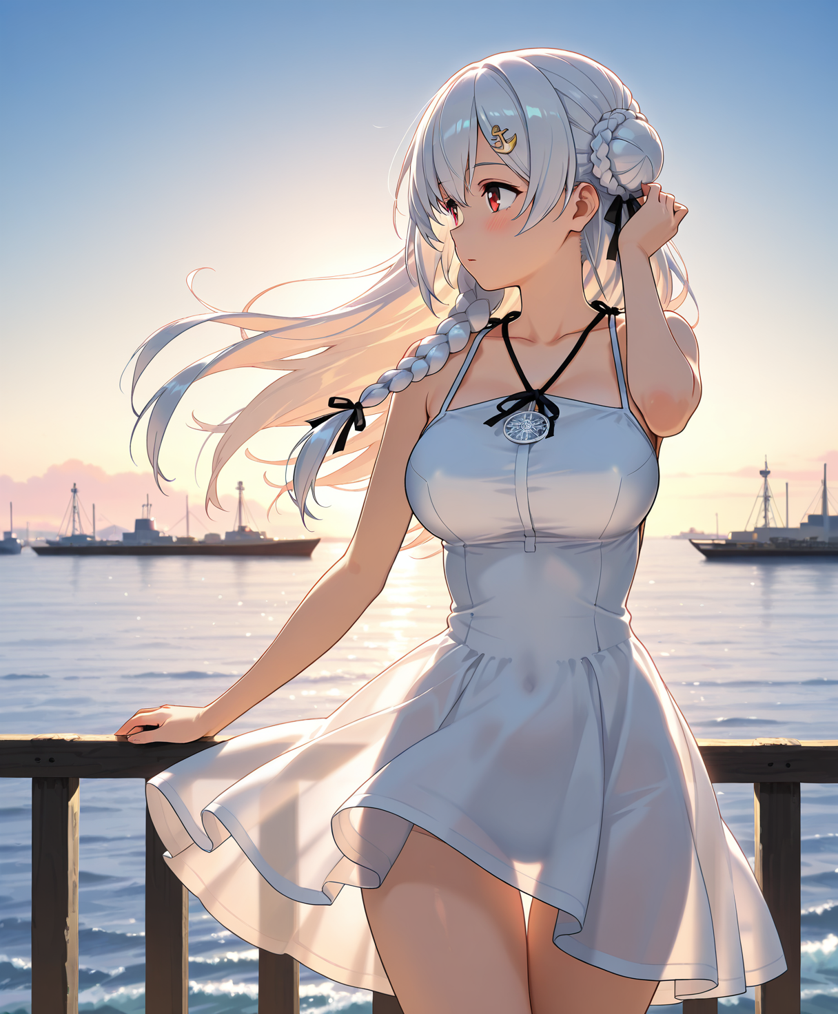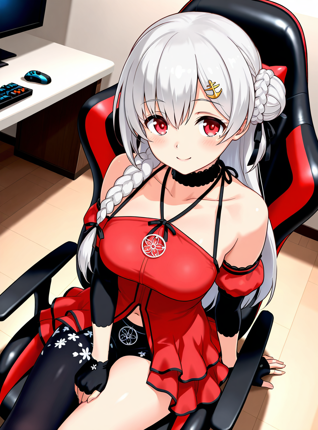 choker, halter open dress, red dress, detached sleeves, fingerless gloves, single leg pantyhose,