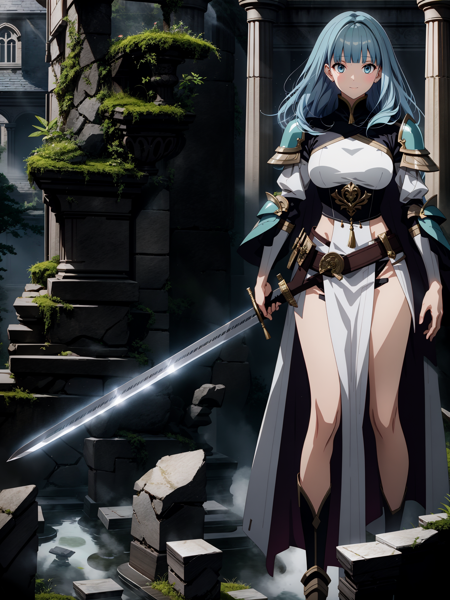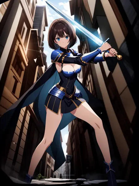 Please use a resolution of 512x768 or similar aspect ratio. It is highly likely that SD will not render the fingers correctly, in particular those gripping the hilt, so manual adjustment or inpainting is recommended.