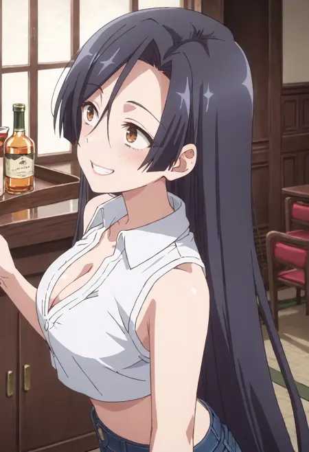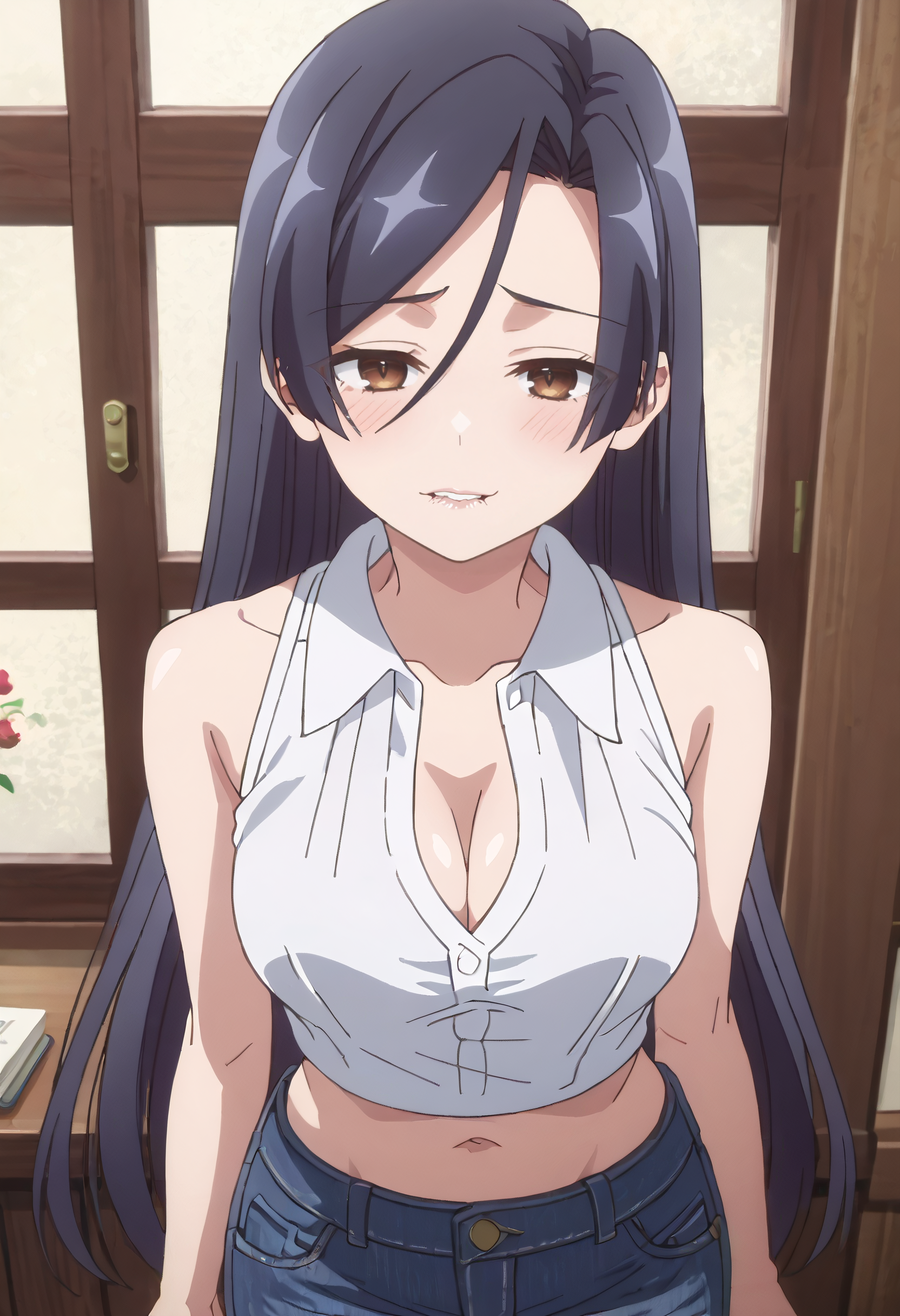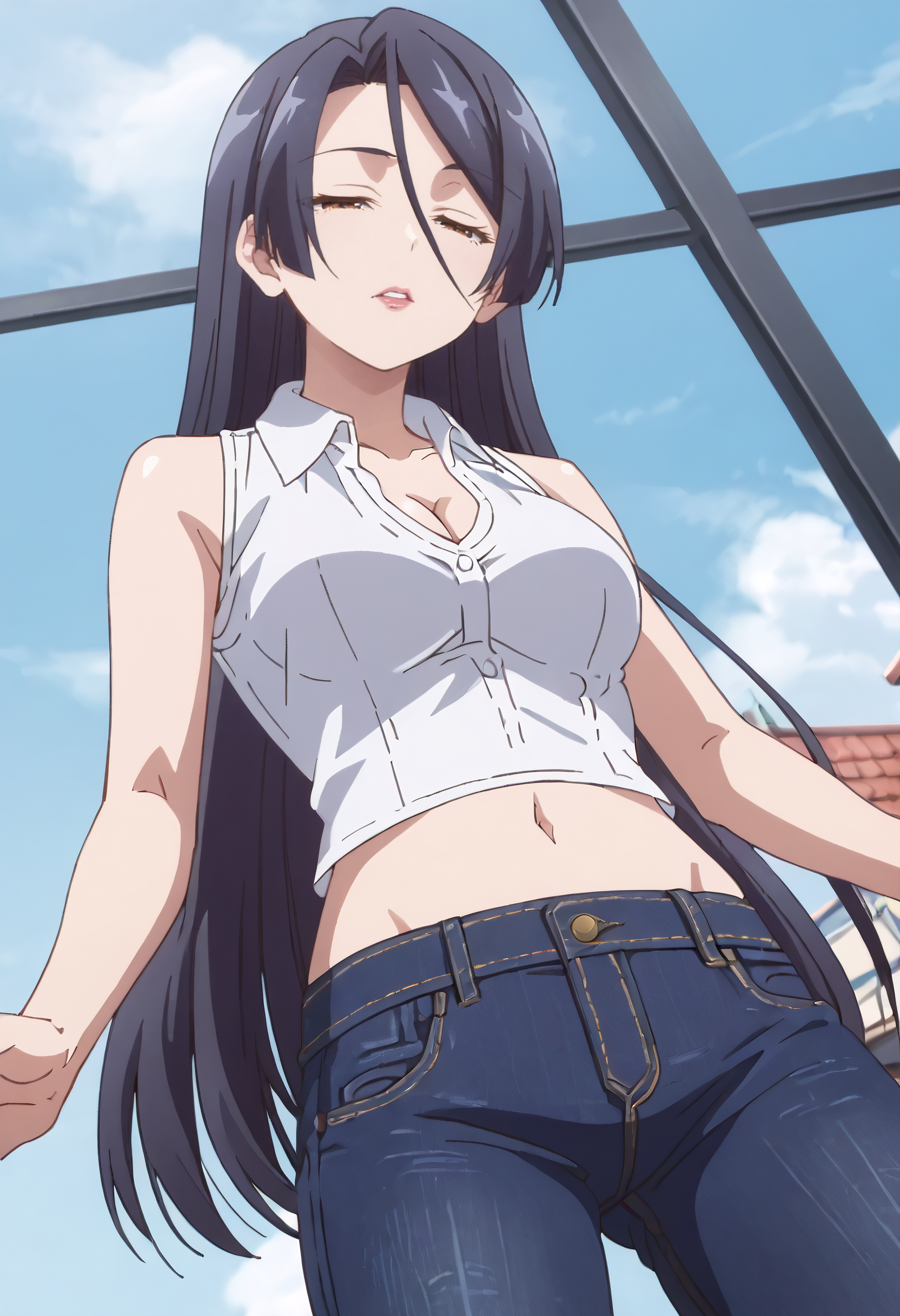 ShirleyShirt、胸元、ノースリーブ、ノースリーブシャツ、シャツ、白いシャツ、ストレートヘア、襟付きシャツ、クロップドトップ、お腹の部分、ズボン、ジーンズ、デニム、裸の肩、クロップドシャツ、裸の腕、