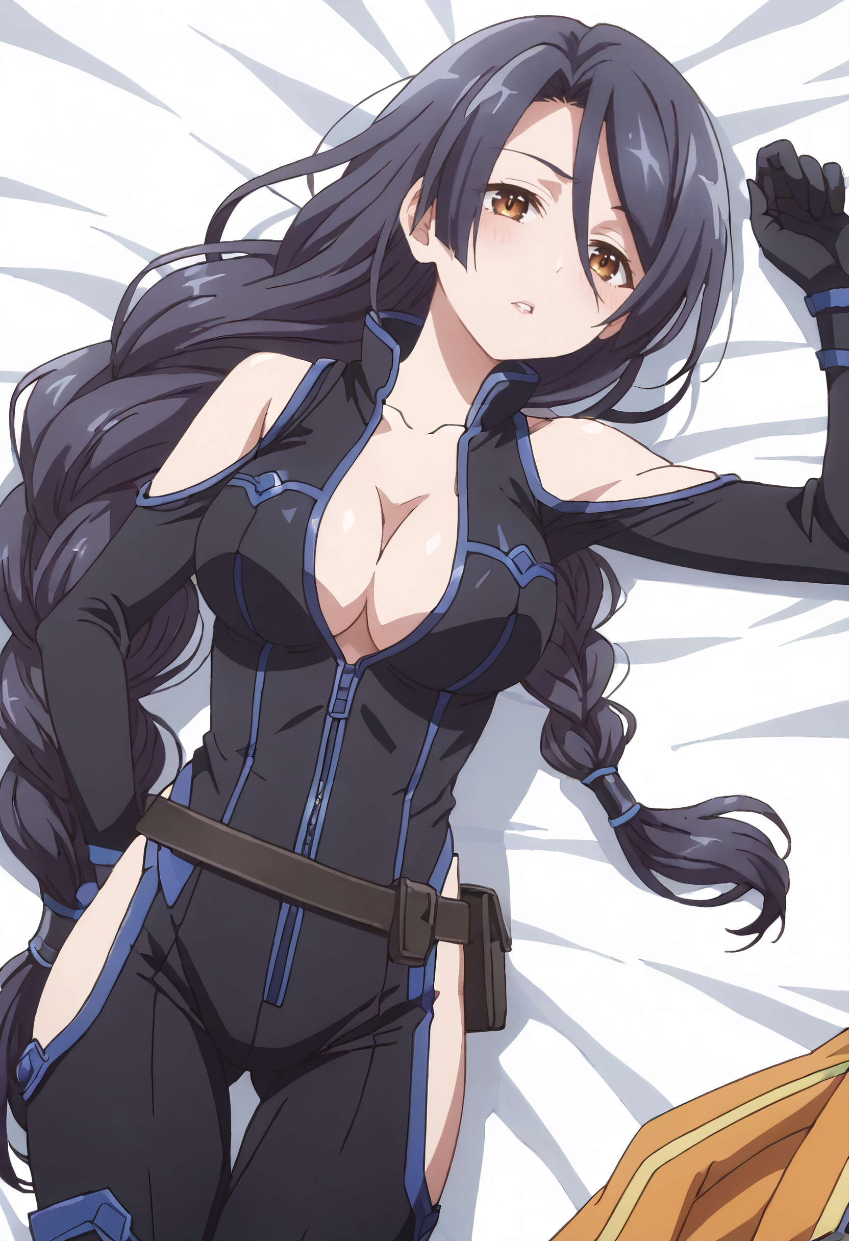 ShirleyBodysuit、肩の切り替え、ボディスーツ、衣装の切り替え、黒いボディスーツ、ヒップの通気孔、黒い手袋、ブーツ、太ももの切り替え、手袋、編み髪、低く編んだ長い髪、低く結んだ長い髪、胸元、一本編み、ベルト、編み上げポニーテール、ポーチ、裸の肩、長い編み髪、開いたボディスーツ、ノースリーブ、肘まで手袋、中央開き、