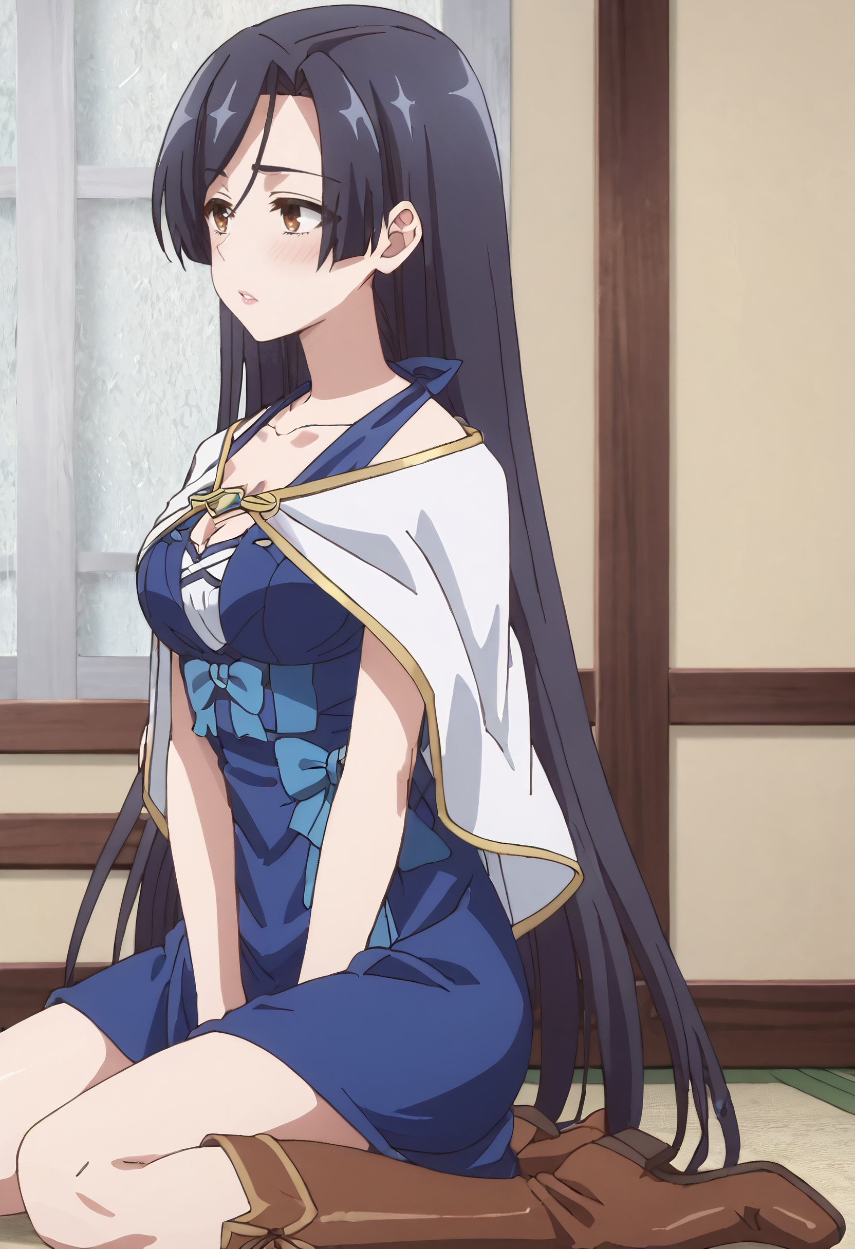 ShirleyDress、カプリ丈のカーディガン、白いカプリ丈のカーディガン、ドレス、青いドレス、胸元、鎖骨、ストレートヘア、青いリボン、ブーツ、茶色の靴、