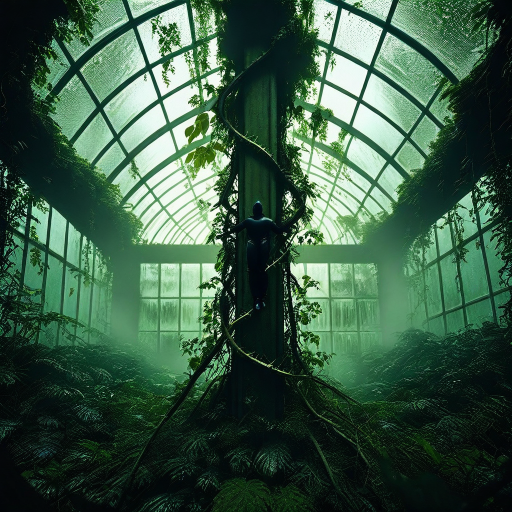 トリガー語句: "過剰に繁茂した温室の恐怖、無顔の男性を包み込む太いツル、ツルに吊り下げられた黒いボディスーツ、暗黒の植物的悪夢"