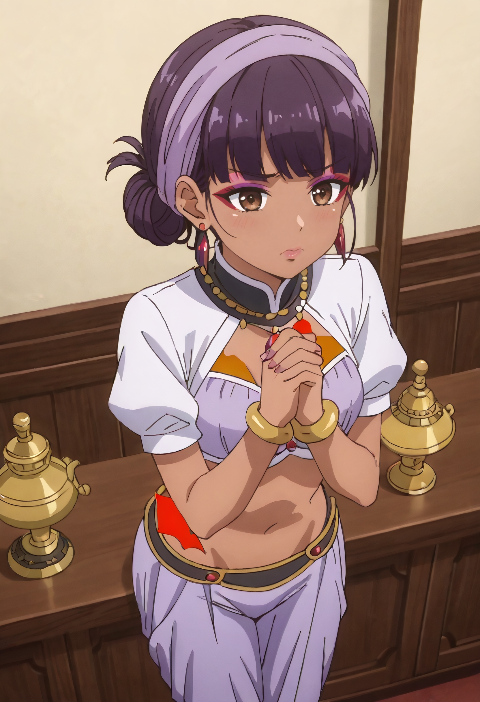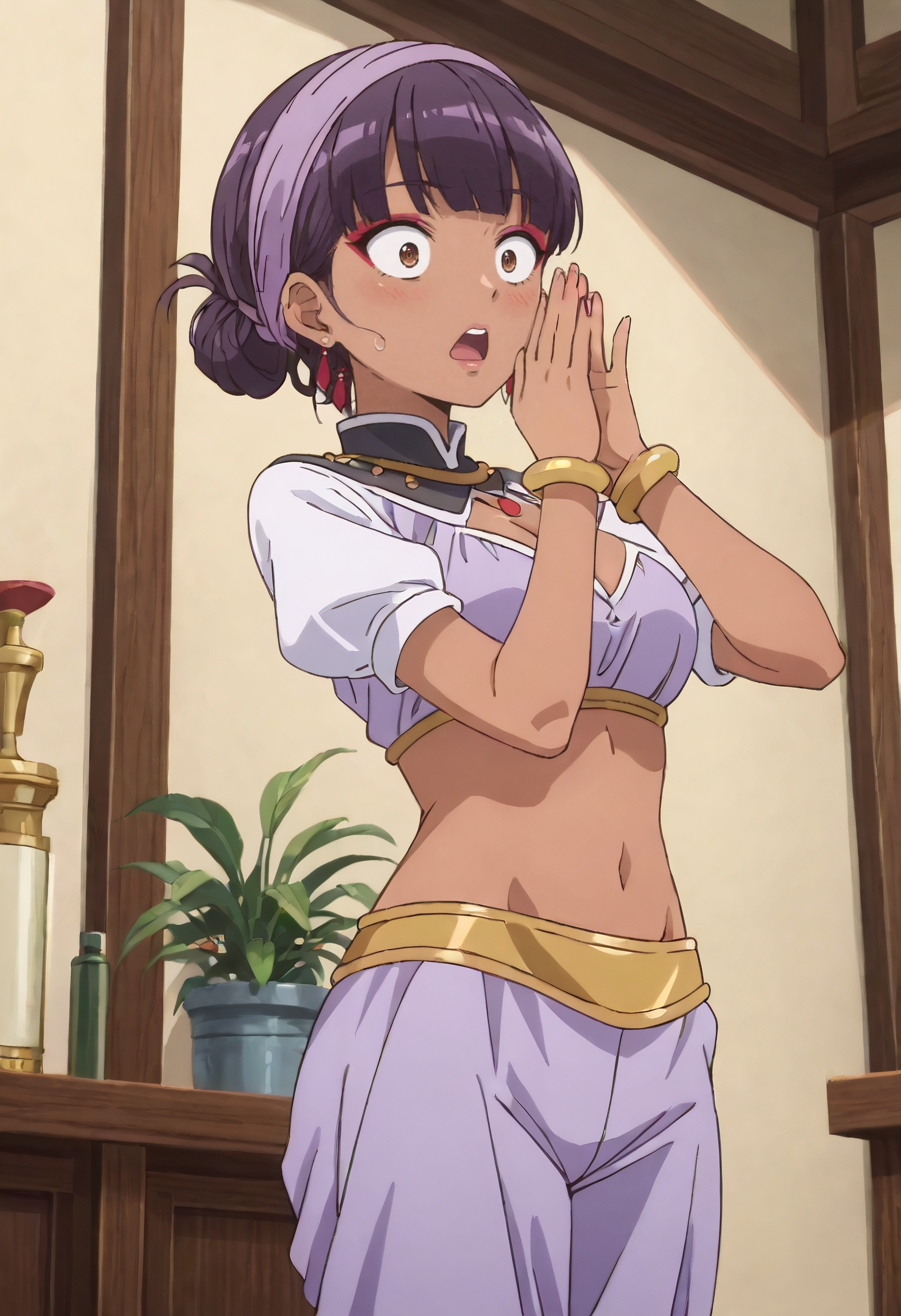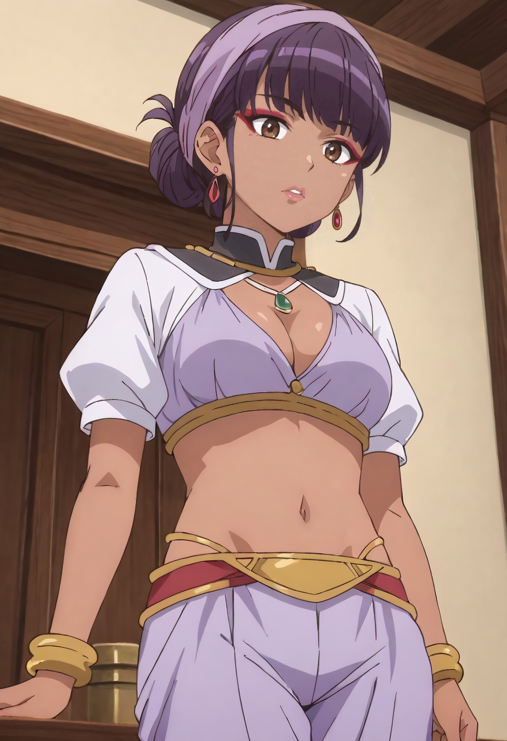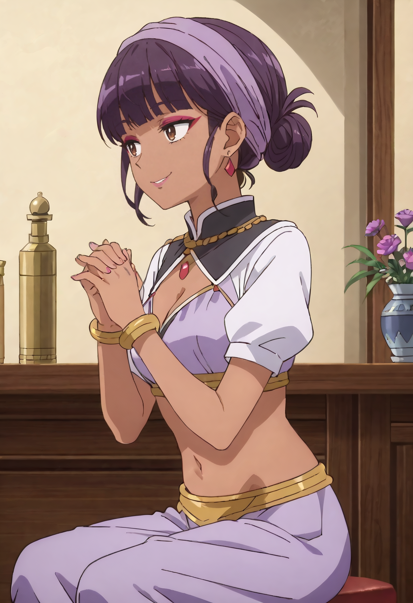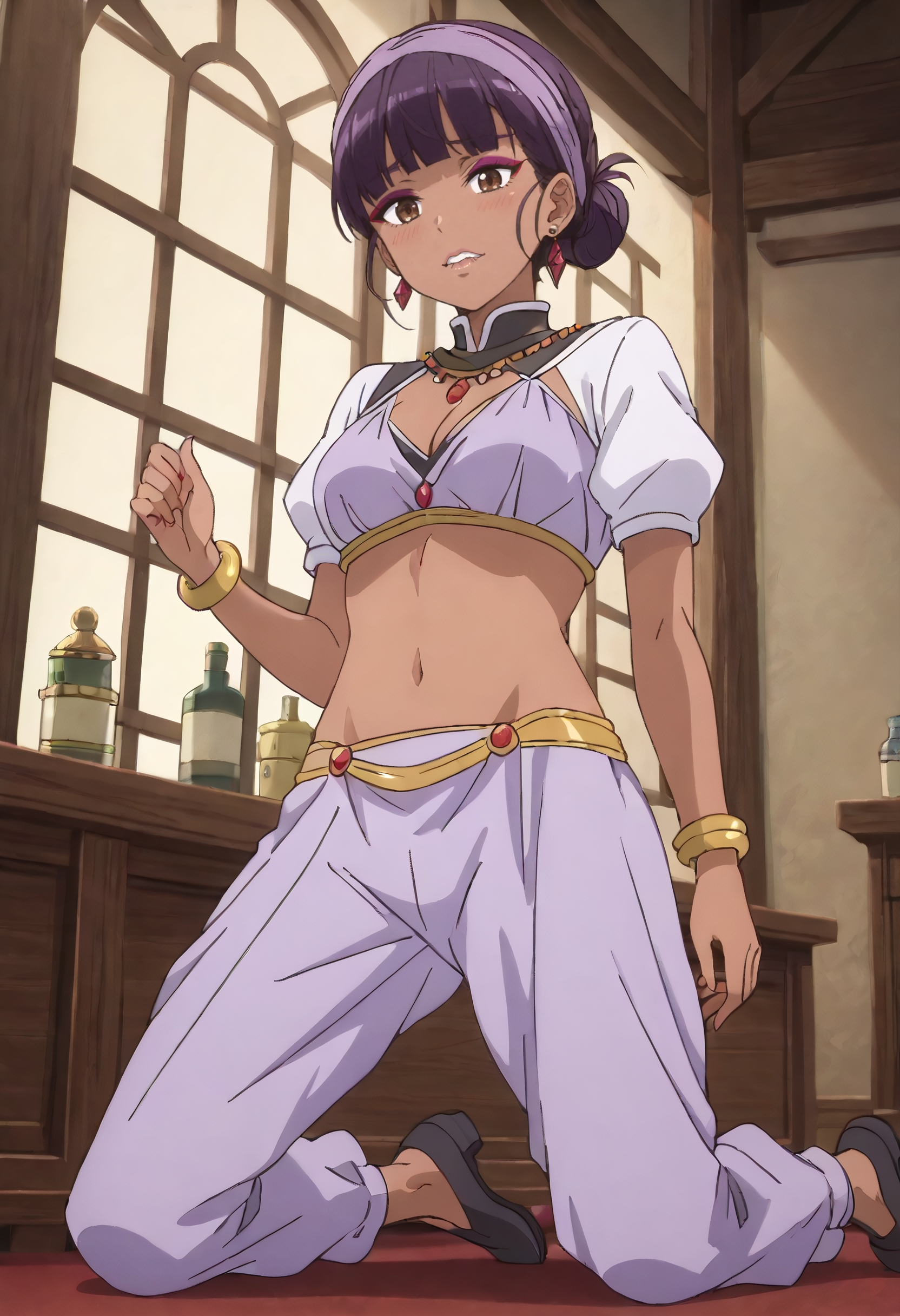 MerchantOutfit、ジュエリー、バンダナ、ズボン、短い袖、紫のズボン、胸元の露出、お腹の露出、イヤリング、ブレスレット、ショートトップ、ヘアバンド、ネックレス、ヘッドバンド、ふくらはぎの膨らんだズボン、ふくらはぎの膨らんだ袖、ゆったりしたズボン、