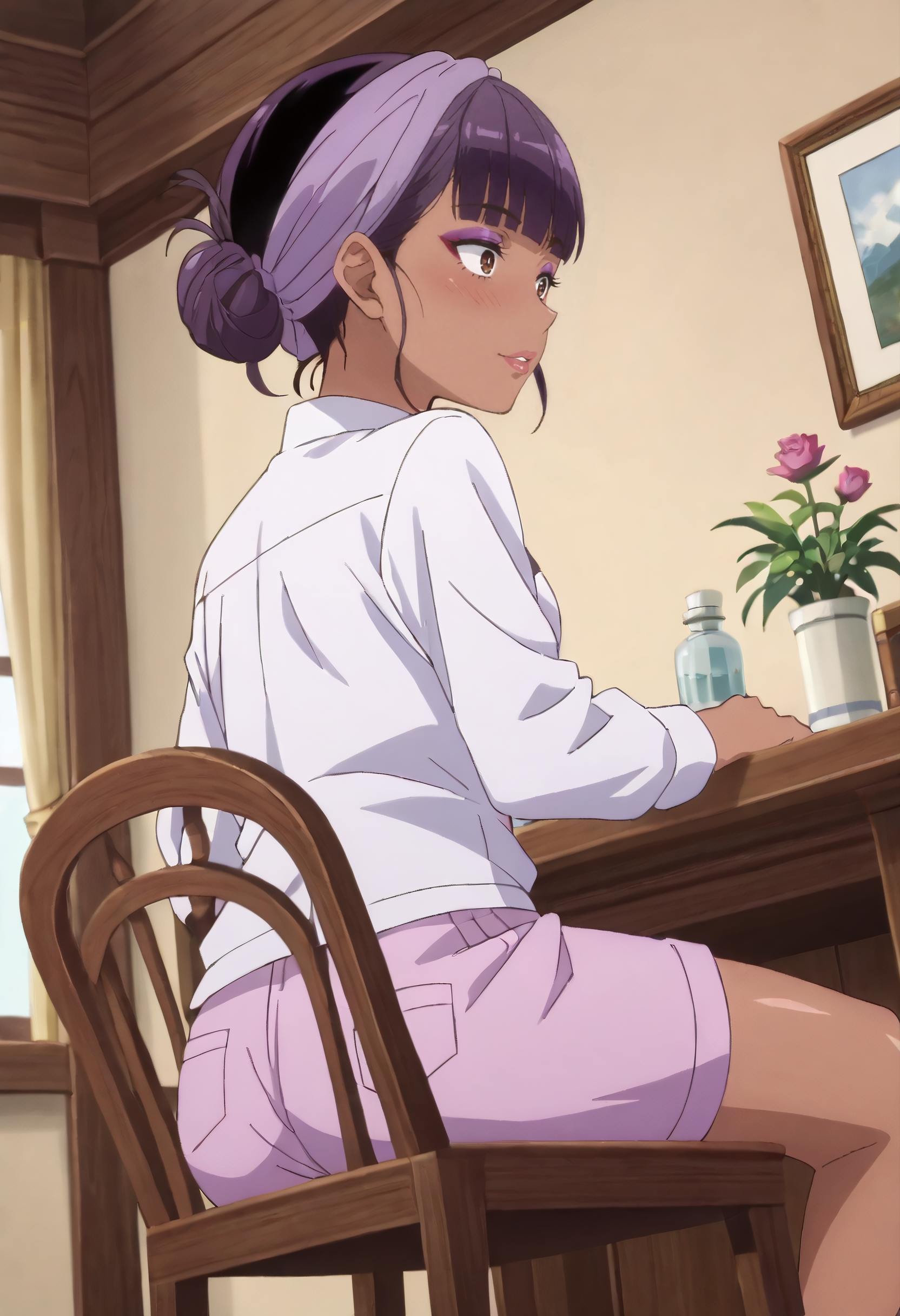 JHNMerchant、紫髪、短髪、ストレートな前髪、片側の髪の結び目、髪の結び目、茶色い目、肌の黒い女性、濃い肌、化粧、アイシャドウ、アイライナー、