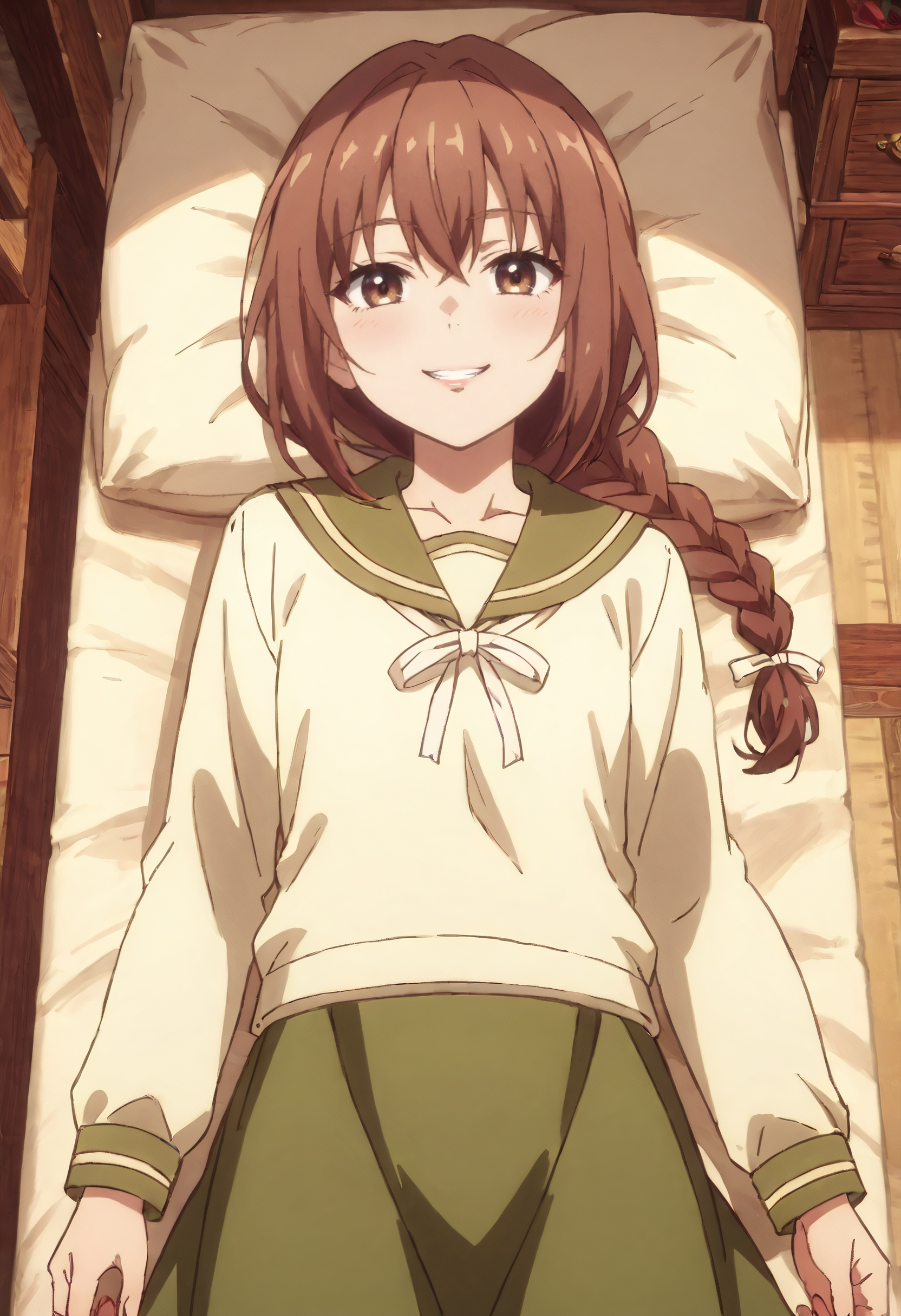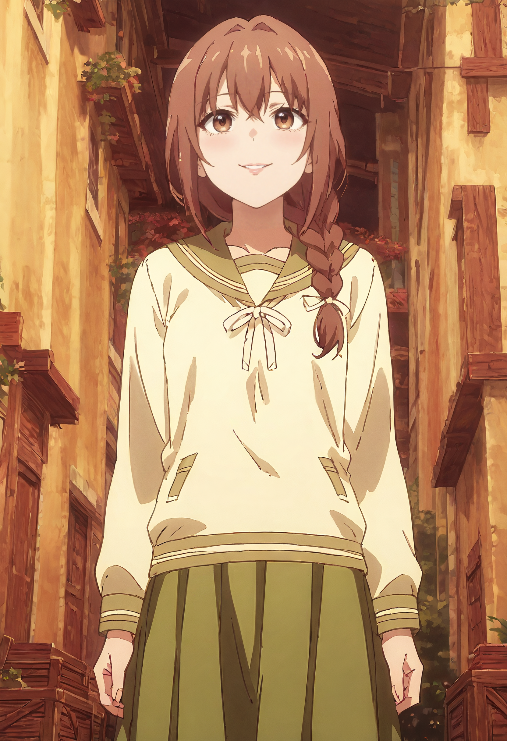 MayMOutfit, 세라후쿠, 흰 셔츠, 셔츠, 치마, 긴 치마, 긴 소매, 녹색 치마, 리본, 머리 리본, 갈색 해적 칼라, 흰 리본, 해적 칼라