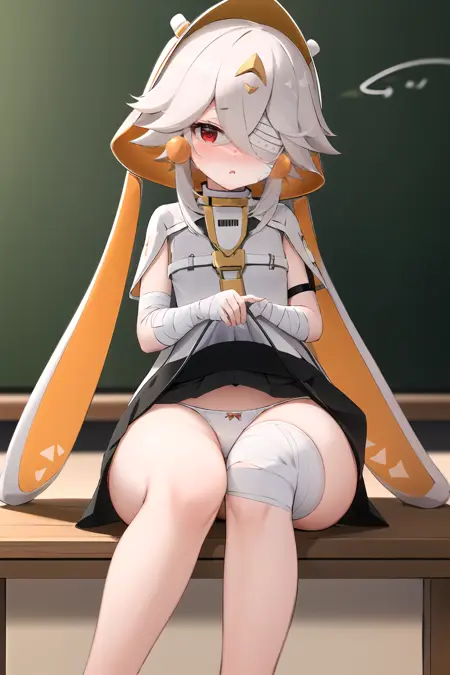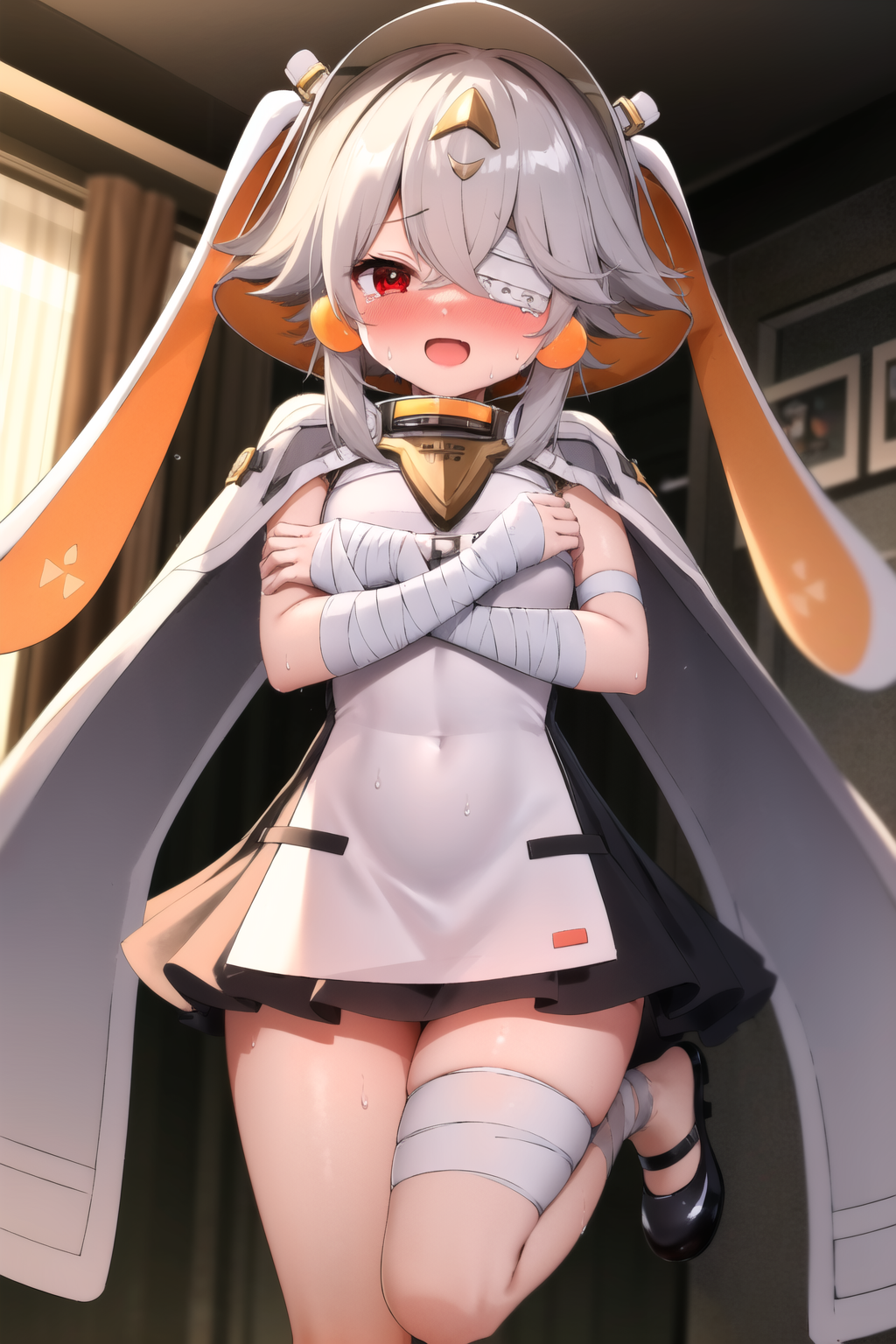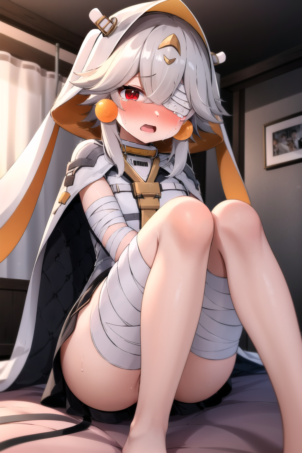 関連タグ: red eyes, white dress, rabbit hood, cloak, earrings, hair ornament, short hair, holding stuffed bunny, bandaged arm, bandaged leg, eyepatch