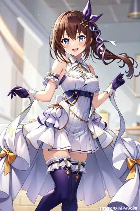 礼服服装: tokinosoradressHL,长发,微笑,张嘴,蓝眼睛,发饰,长筒袜,手套,连衣裙,丝带,发带,无袖,发夹,白色连衣裙,侧马尾,发帘,发饰,紫色手套
