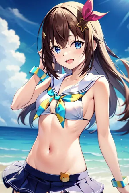 夏季服装: tokinosorasummerHL,长发,蓝眼睛,裙子,发饰,丝带,肚脐,露肩,泳装,发带,比基尼,百褶裙,发夹,迷你裙,水手领,红丝带,蓝裙子,白色比基尼,发帘,粉红丝带,水手比基尼,