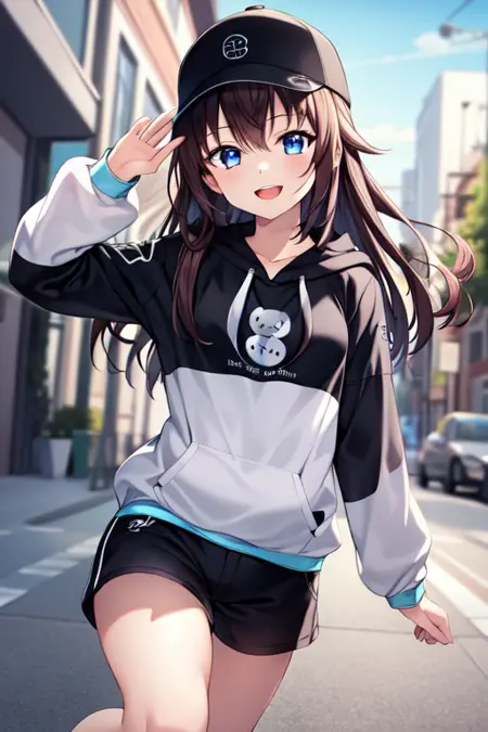 连帽衫服装: tokinosorahoddieHL,长发,微笑,张嘴,蓝眼睛,长袖,帽子,短裤,连帽,头饰,连帽衫,短裤,棒球帽,发帘,