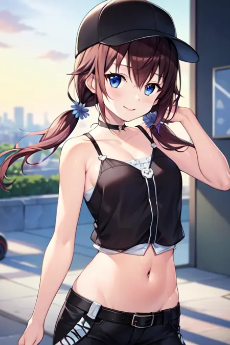 脱去夹克: tokinosoraparkaHL,长发,微笑,蓝眼睛,衬衫,帽子,肚脐,双马尾,短裤,露脐,腰带,短上衣,黑色衬衫,超短裤,黑色头饰,低双马尾,黑色短裤,无袖