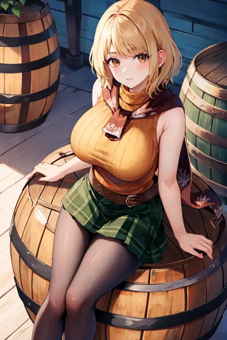• 원래 외모를 원하면 "brown eyes, bangs, red scarf, orange sweater, sleeveless turtleneck, green miniskirt, belt, pantyhose"를 추가하세요.