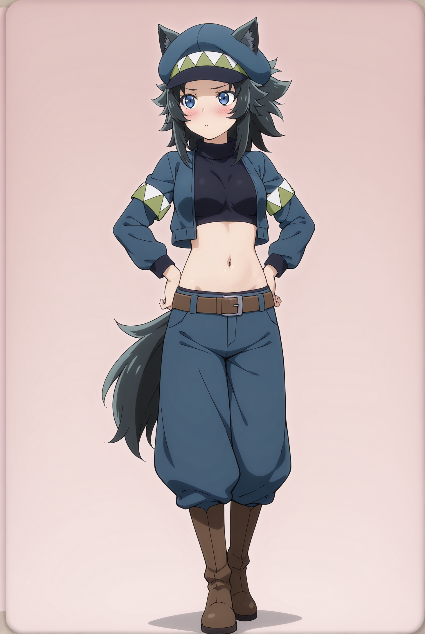 青いタクシー帽、青いジャケット、クロップトップ、青いズボン、ベルト