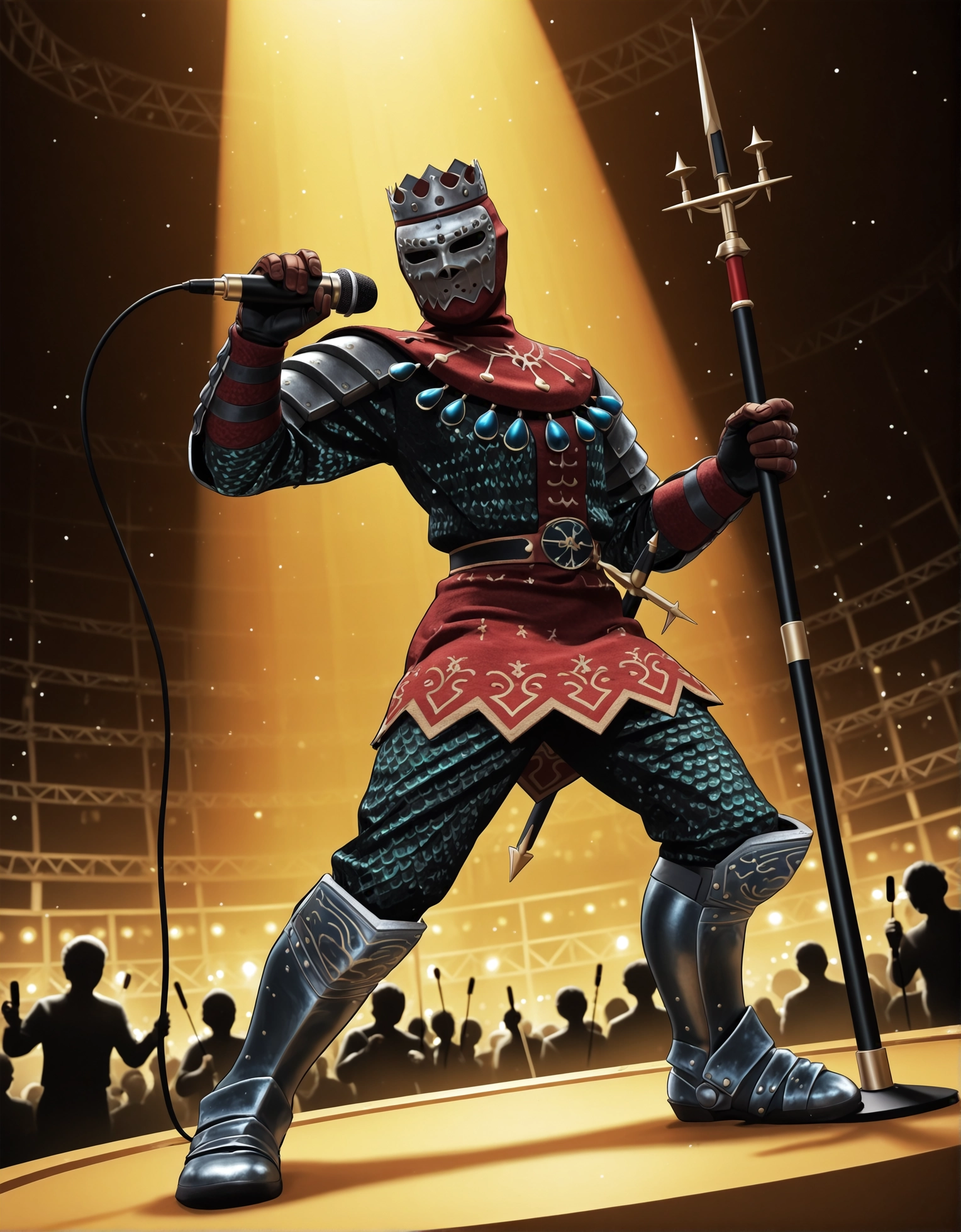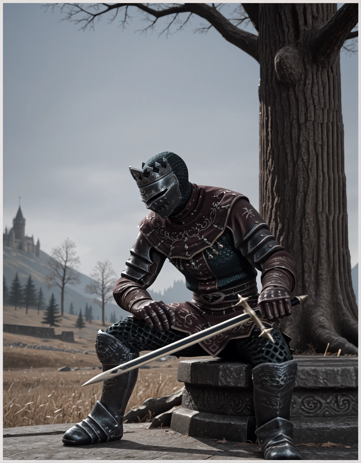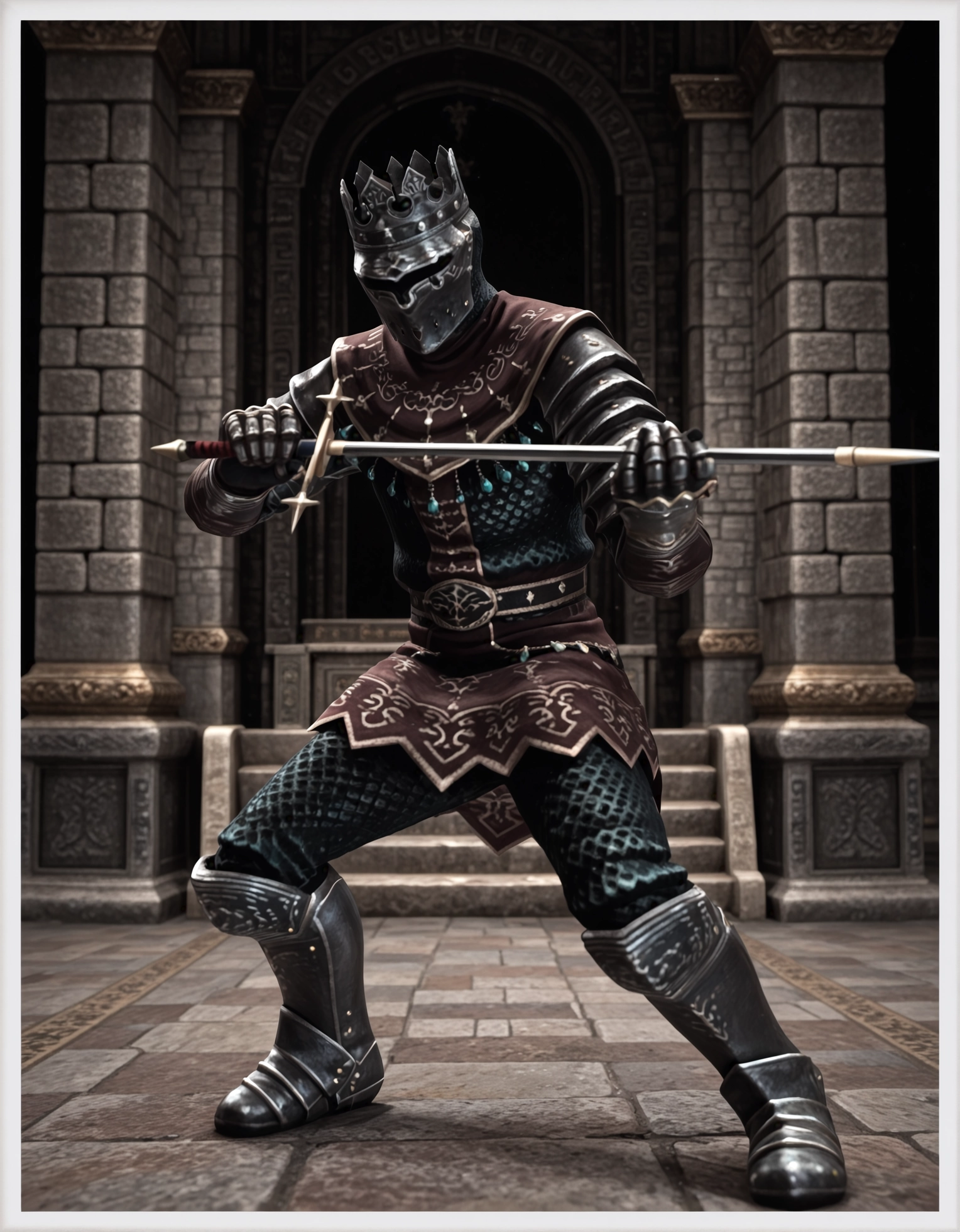 (LightDarknut:1.3), チェーンメール、銀の冠、金属製のマスク、冠付きヘルメット、足甲、軽装備、サバー、装甲済み、