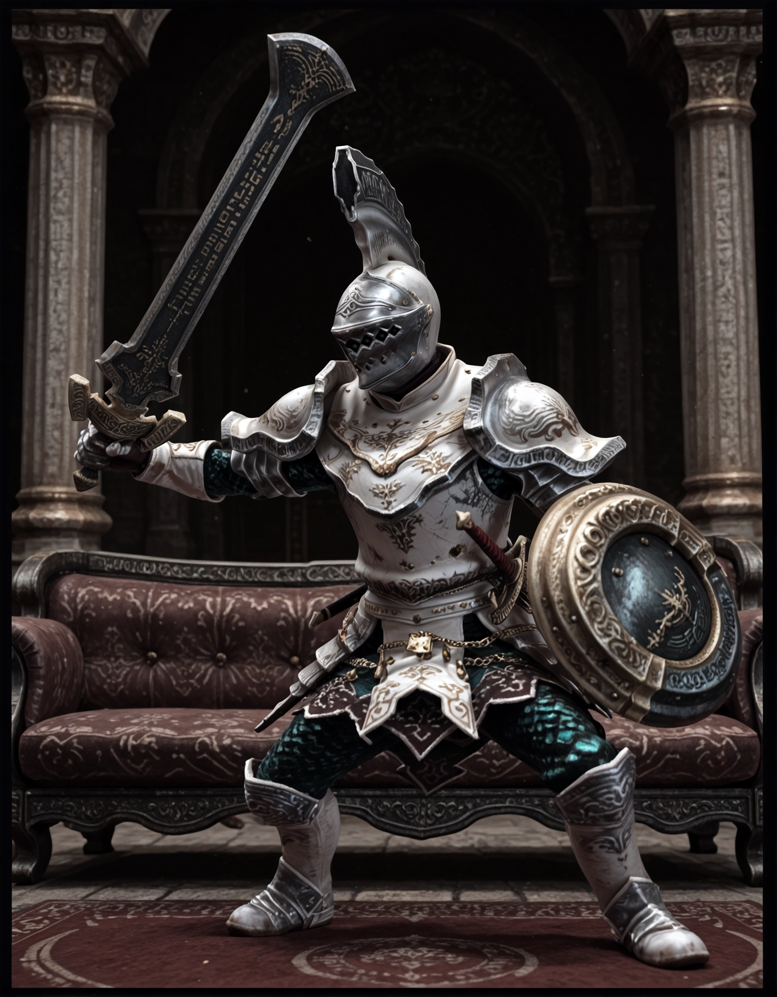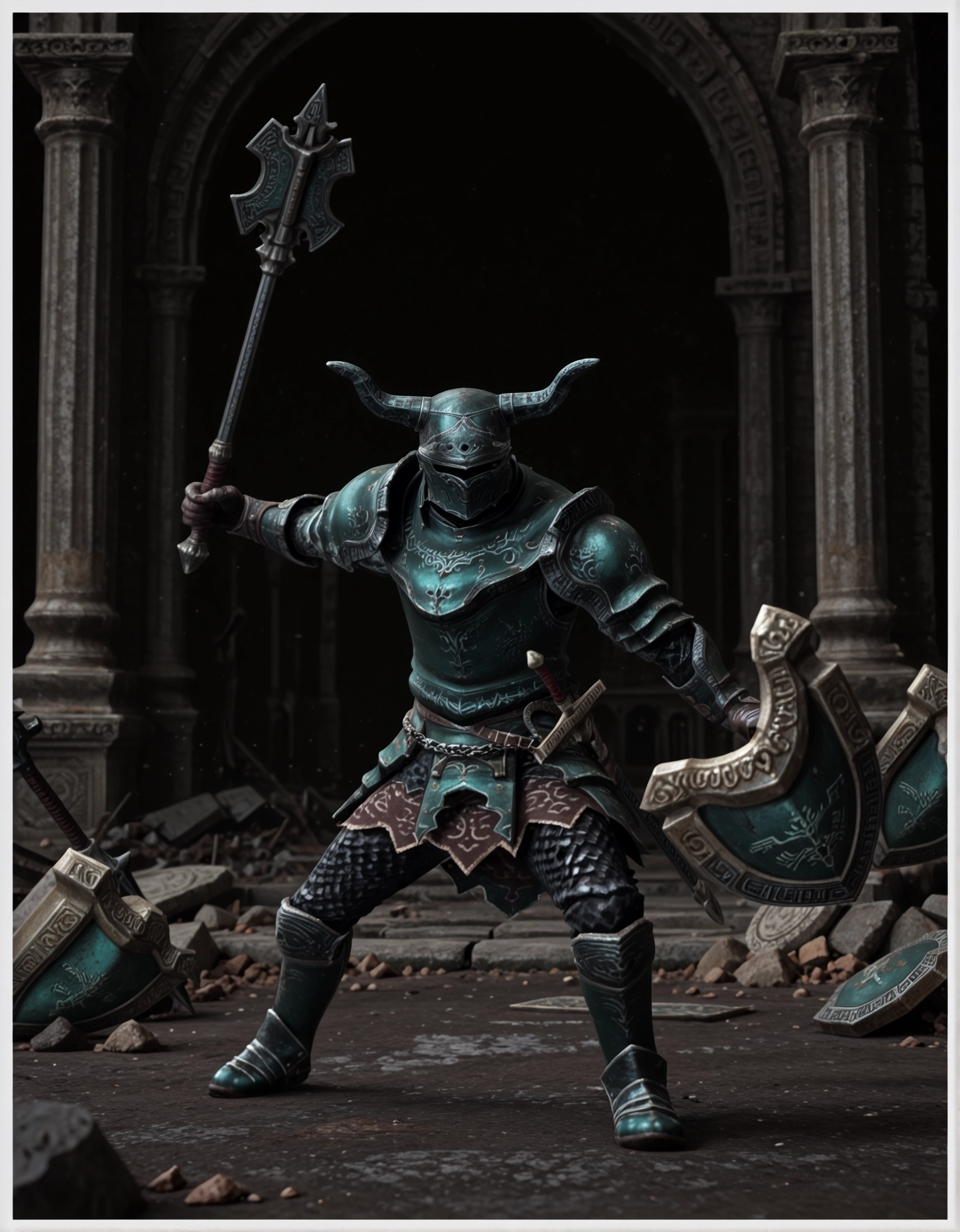 (HornedDarknut:1.3) ケイトシールド、{大剣|クラブ、鋸歯状クラブ}、角付きヘルメット、{赤|緑|グレー}の鎧、腰に差した剣、全身鎧、