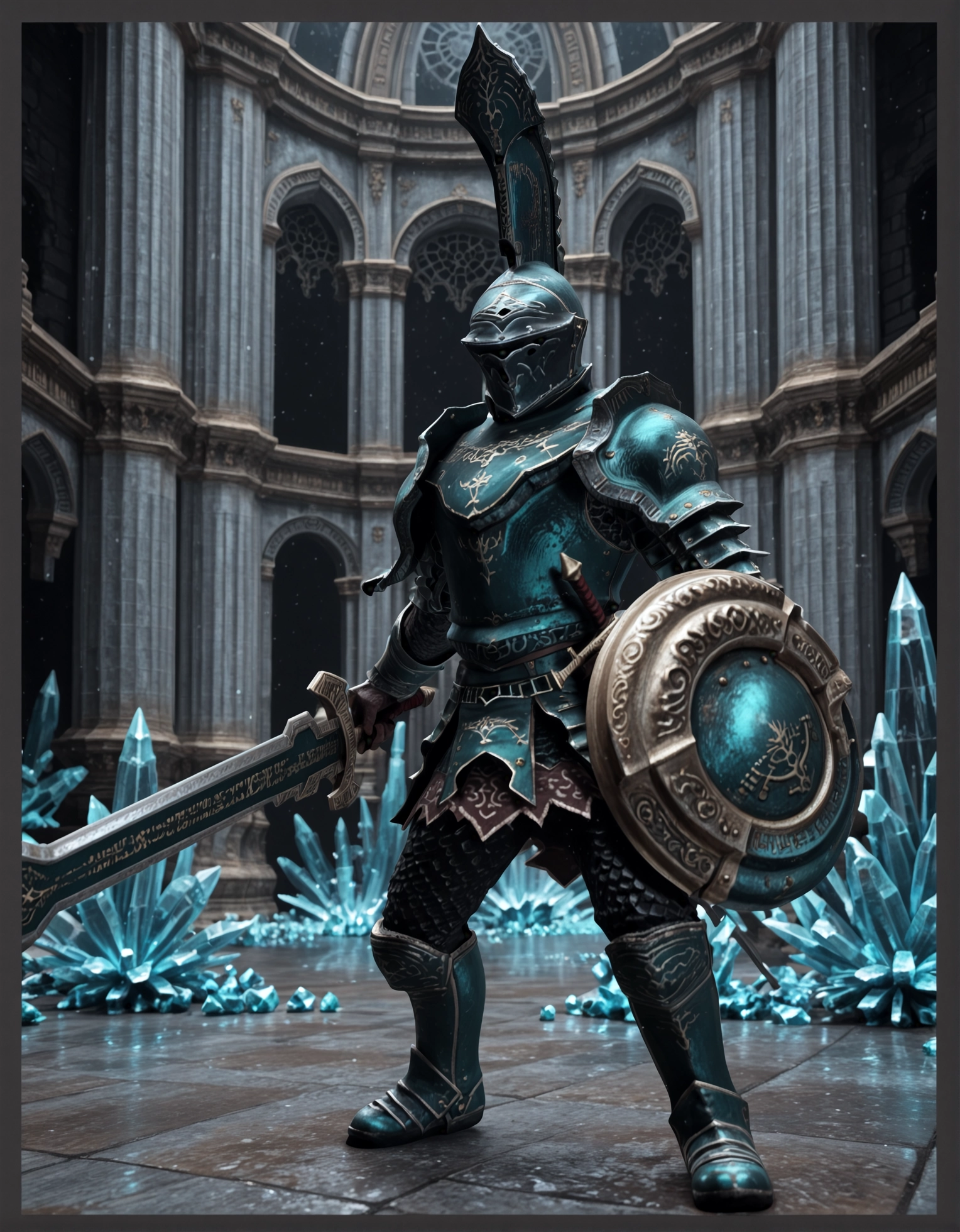(TempleDarknut:1.3), , 黒い鎧、黒色の鎧、冠付きヘルメット、大剣、ヘルメットの冠、稜線の冠、丸型の盾、腰に差した剣、全身鎧、